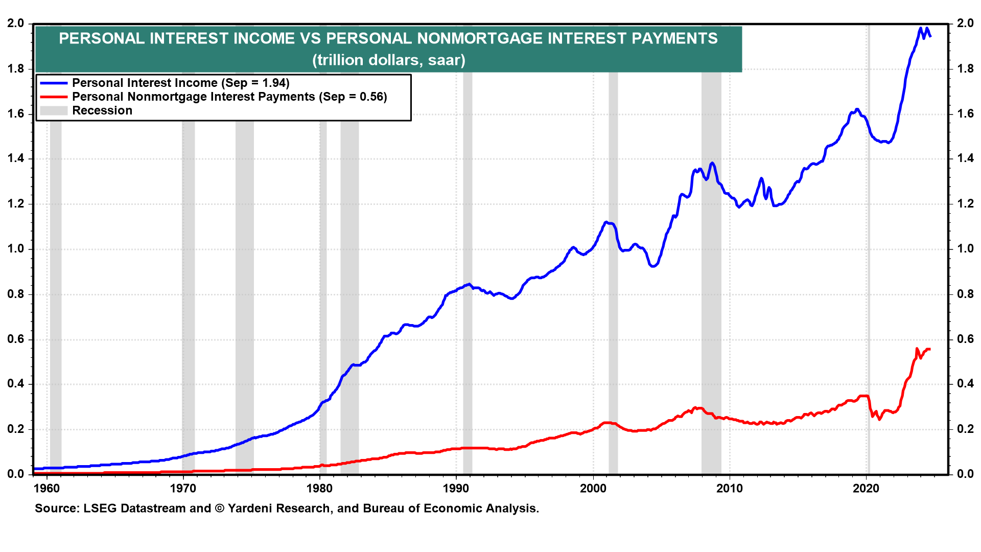 Focus on those numbers for a minute. The decline in the government’s spending on pandemic-related income support after the contagion abated has been largely offset by the government’s outlays on net interest as the federal debt and interest rates have soared (Fig. 3 below). Most of those interest payments have boosted personal income. Since January 2022 through September of this year, personal interest income has soared by $432 billion to $1.94 trillion (Fig. 4 below). Over the same period, personal nonmortgage interest payments rose $278 billion to $0.6 trillion.