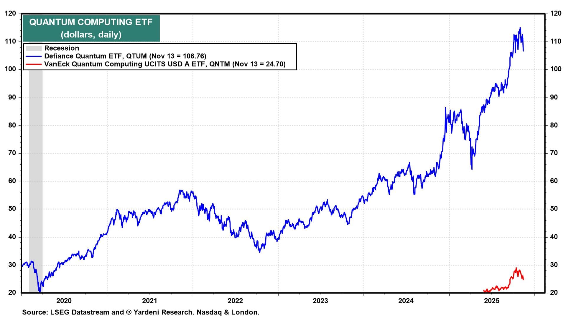 IonQ, Rigetti Computing, and D-Wave Quantum are among the companies reportedly in discussion with the government. Quantum stocks have risen sharply this year, including the shares of IonQ (30.3%), Rigetti (105.8), and D-Wave (245.1) (chart).