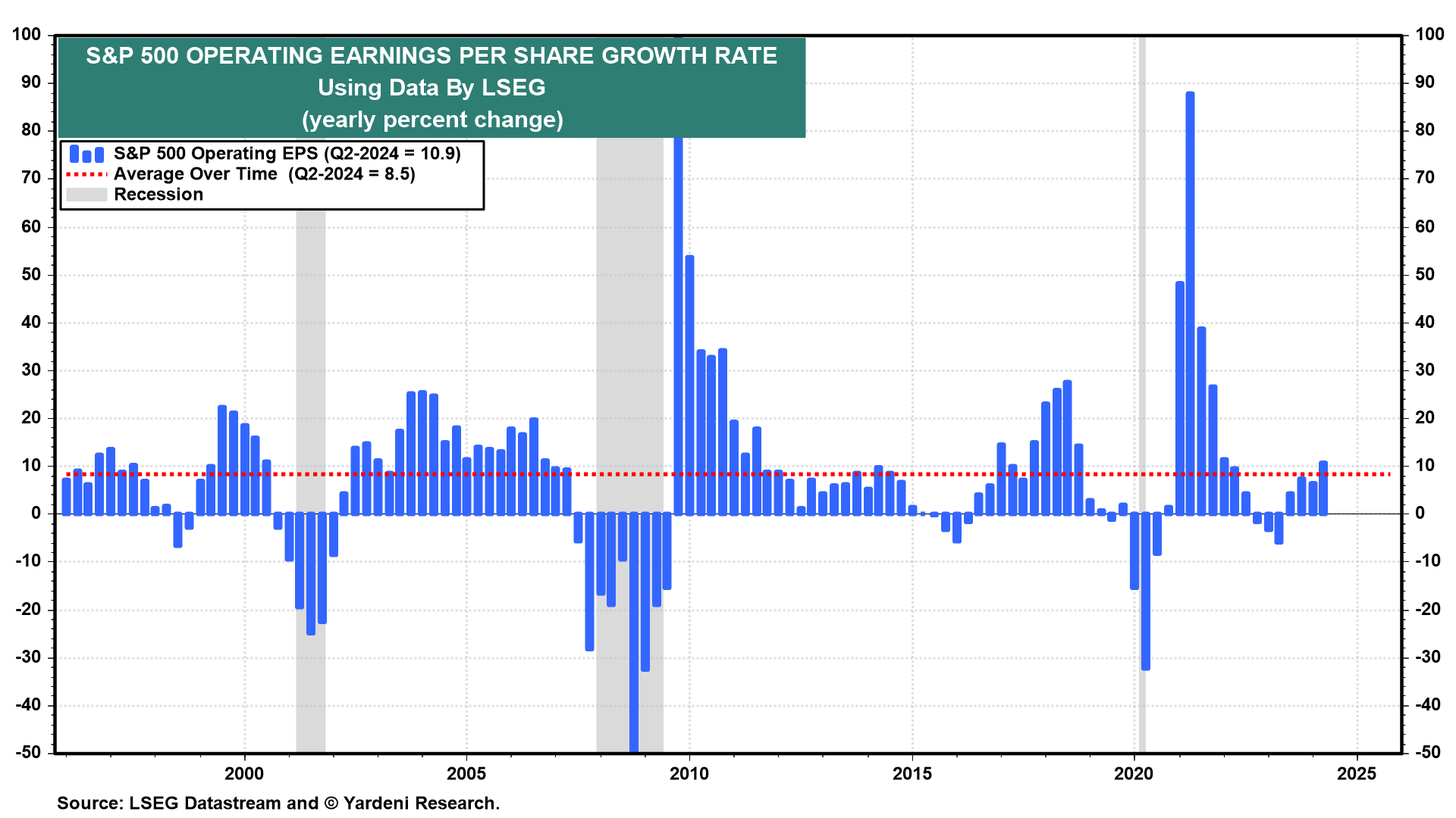 There’s no sign of an imminent recession in the latest earnings reporting season. Joe notes that more than 90% of the S&P 500 companies have reported their earnings for Q2. Collectively, S&P 500 operating earnings per share (EPS) rose 10.9% y/y during the quarter to a record high of $60.19 (Fig. 1 below and Fig. 2 below).