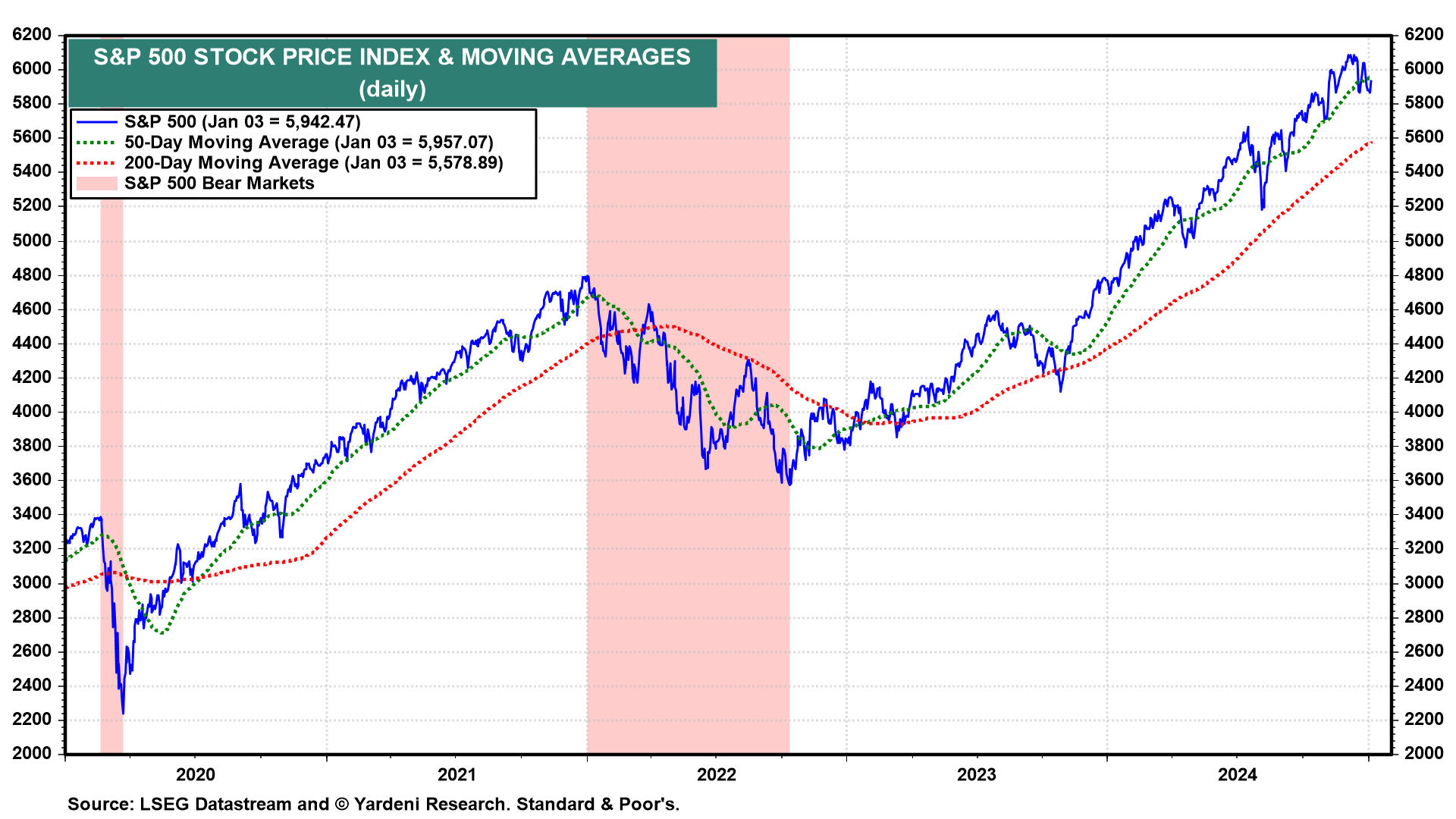 The S&P 500 peaked at a record high of 6090.27 on December 6. It ended 2024 at 5881.63. The index ended the first week of the new year at 5942.47, just below its 50-day moving average (Fig. 5 below). The Nasdaq peaked last year at a record 20,173.89 on December 16 and bounced off its 50-day moving average last week to close at 19,621.7 (Fig. 6).