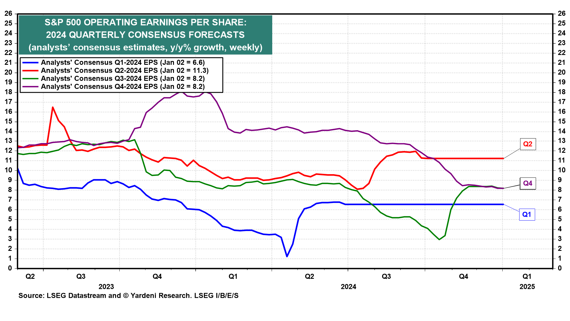 (1) Q4’s earnings reporting season over the next few weeks might be better than expected. They usually are when the economy is expanding. The analysts’ consensus estimate for Q4 earnings growth is 8.2% (Fig. 7 below). There were typical upside earnings surprises during the previous three earnings seasons. There should be another during the Q4 earnings season. Leading the way should be banks, semiconductors, cloud computing, retailers, and restaurants.