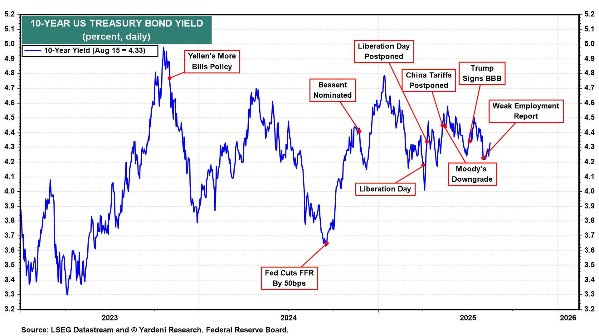Stock investors have been joyously discounting a Fed rate cut in September following the release of July’s weaker-than-expected employment report. The S&P 500 rose to yet another record high on Thursday. It is up 3.4% since the close on August 1—the day of the disappointing jobs report—through Friday’s close. There hasn’t been a similar party in the bond market since then, as the 10-year Treasury yield has risen 10 basis points over the same period (Fig. 6 below).