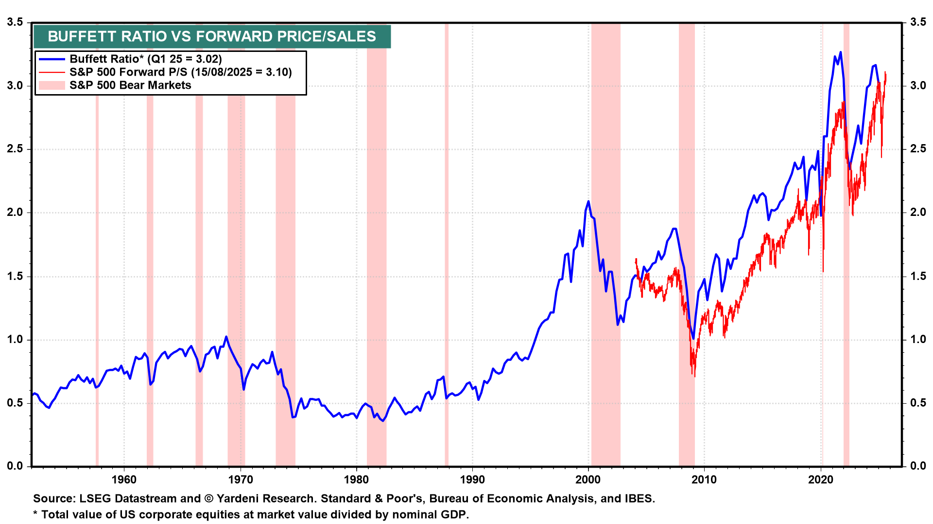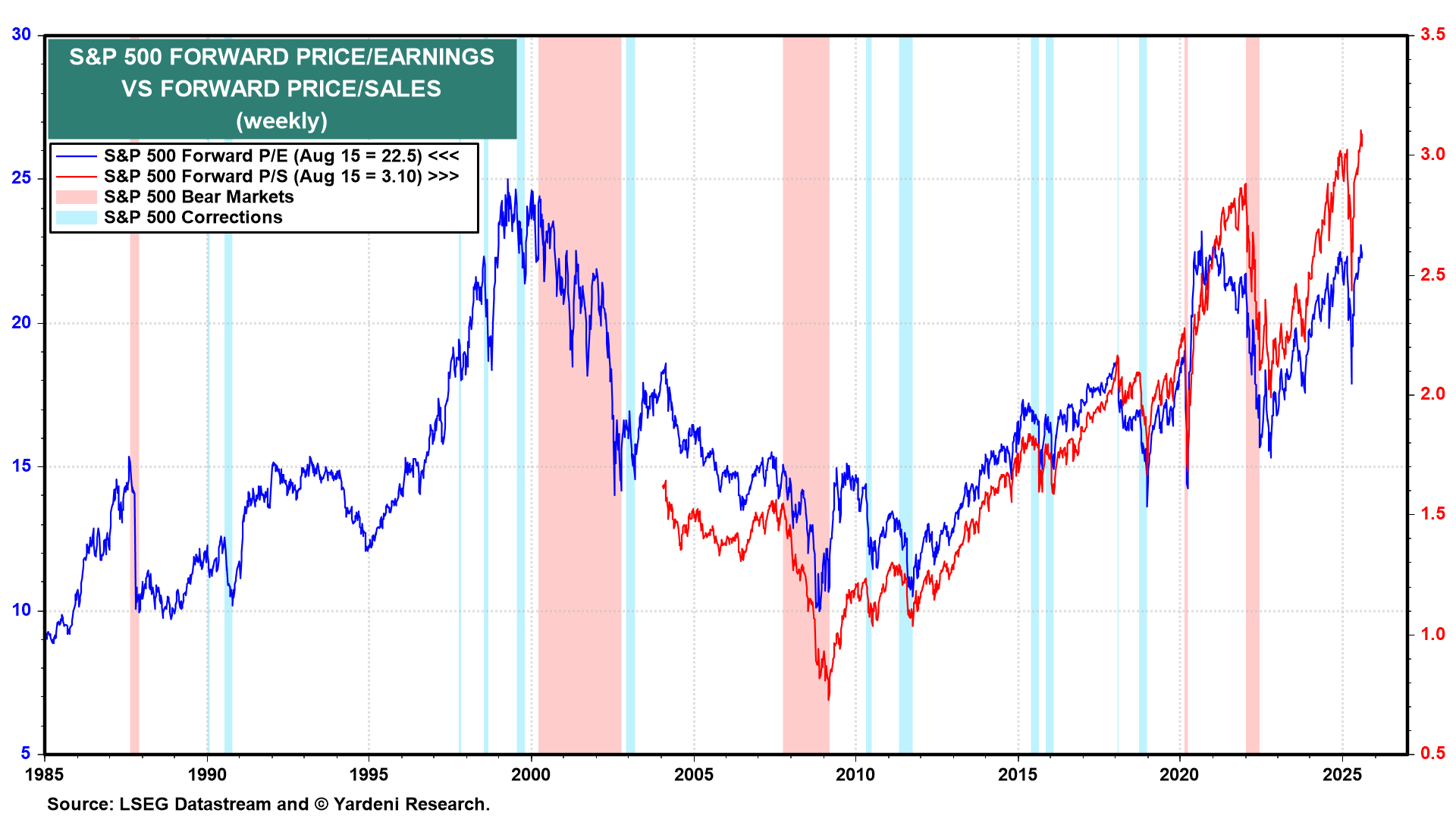 In this scenario, the Fed could very well fuel a wild meltup in the stock market. Valuation multiples would get even more stretched than they are already. On a weekly basis, the Buffett Ratio rose to a record 3.1 during the August 14 week using the forward price-to-sales ratio of the S&P 500 (Fig. 7 below). That same week, the forward P/E of the index rose to 22.5 (Fig. 8 below). It would need to rise only another 11% to match its record high of 25.0, hit just before the Tech Wreck of 2000.