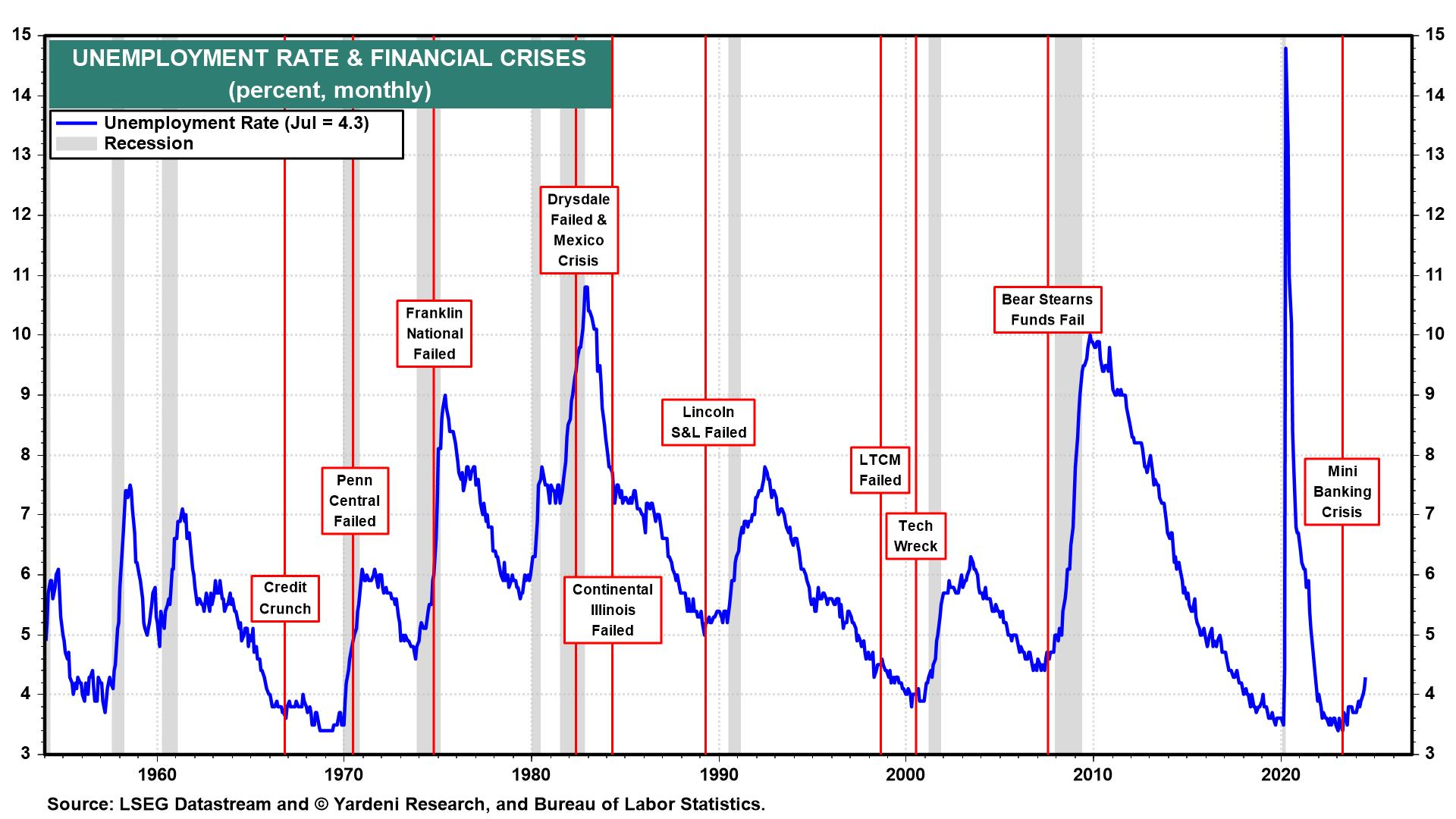 Blaming the Sahm Rule, Carry Trades & Too Many Bulls. The stock markets’ adverse reaction to Friday’s jobs report apparently was to price in a hard landing and to expect a series of federal funds rate (FFR) cuts by the Fed, including a 50-basis-point cut in September. Helping to unnerve investors was that the increase in the unemployment rate might have triggered the Sahm Rule, implying that the jobless rate is about to soar, as it has in the past once the rule was triggered.
