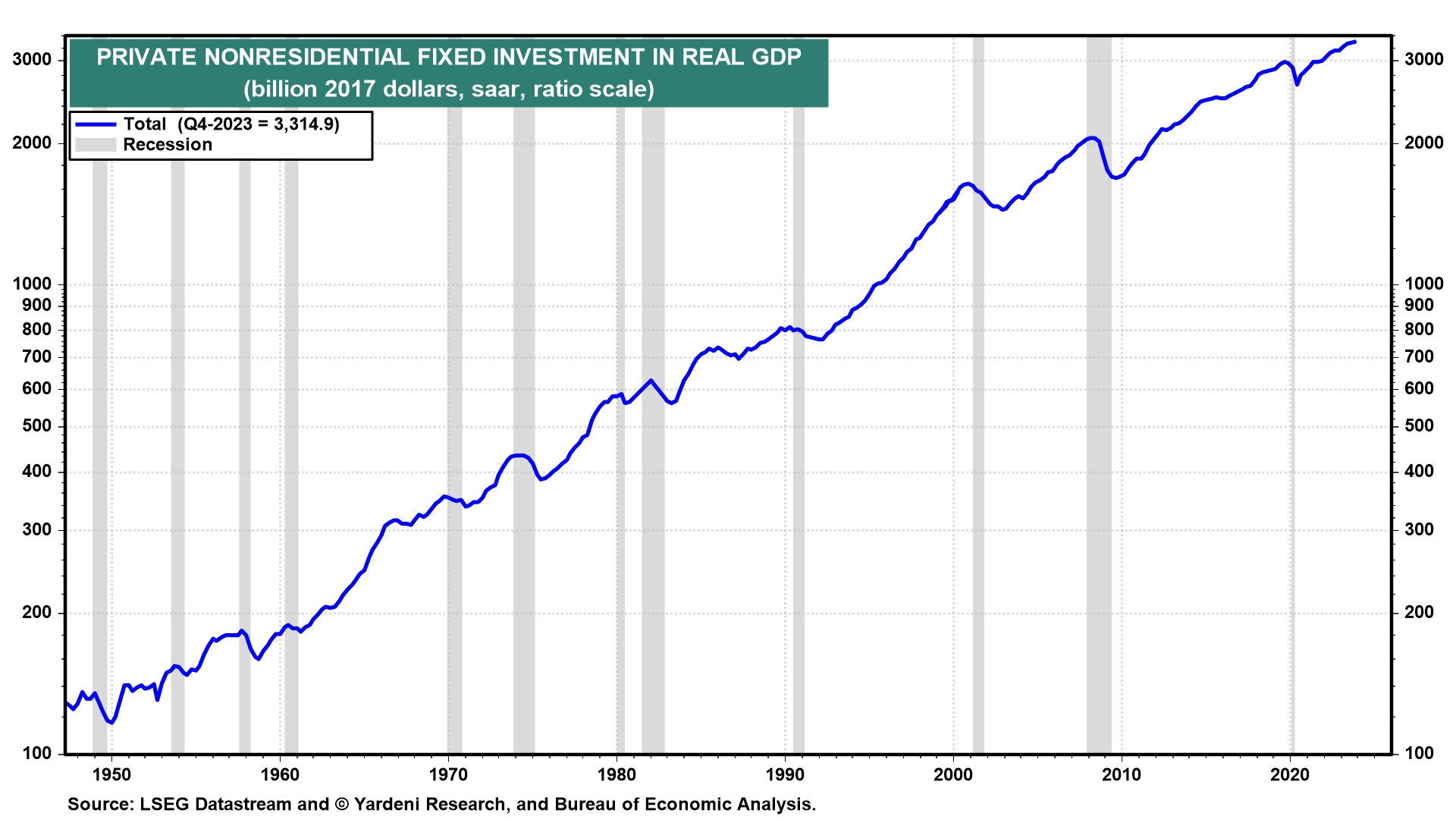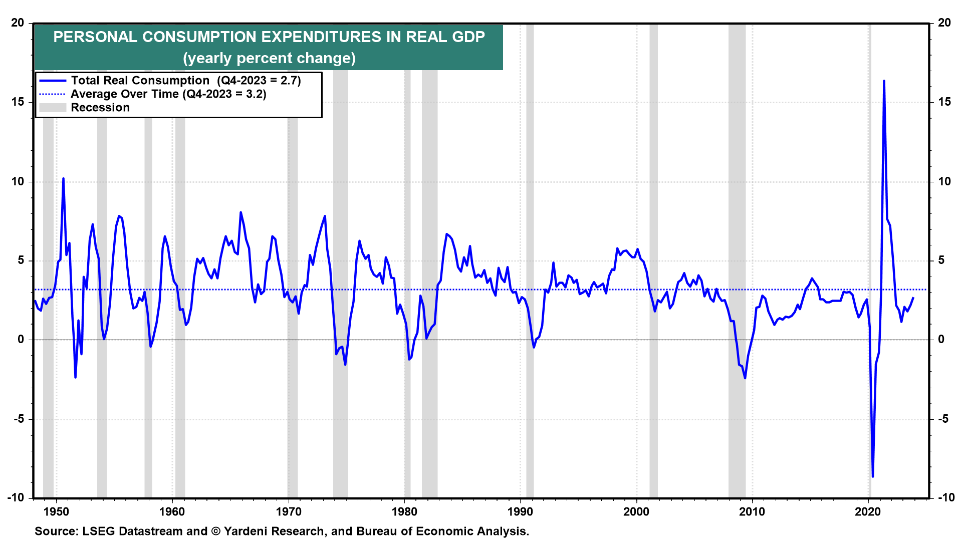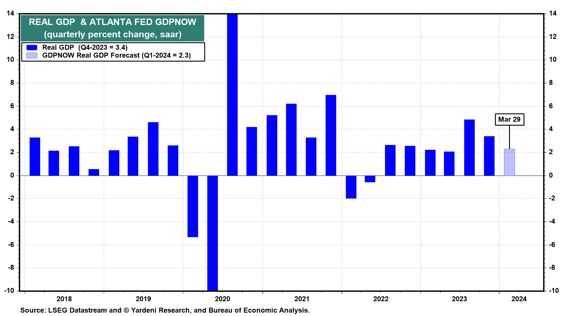 (1) Real GDP. Real GDP for Q4-2023 was revised up from 3.2% (q/q, saar) to 3.4% (Fig. 1 below). Real GDP rose 3.1% y/y last year based on a Q4/Q4 comparison (Fig. 2 below). That matches the average growth rate since 1948. It is up from 0.7% in 2022, which could be described as a “soft landing,” we suppose.