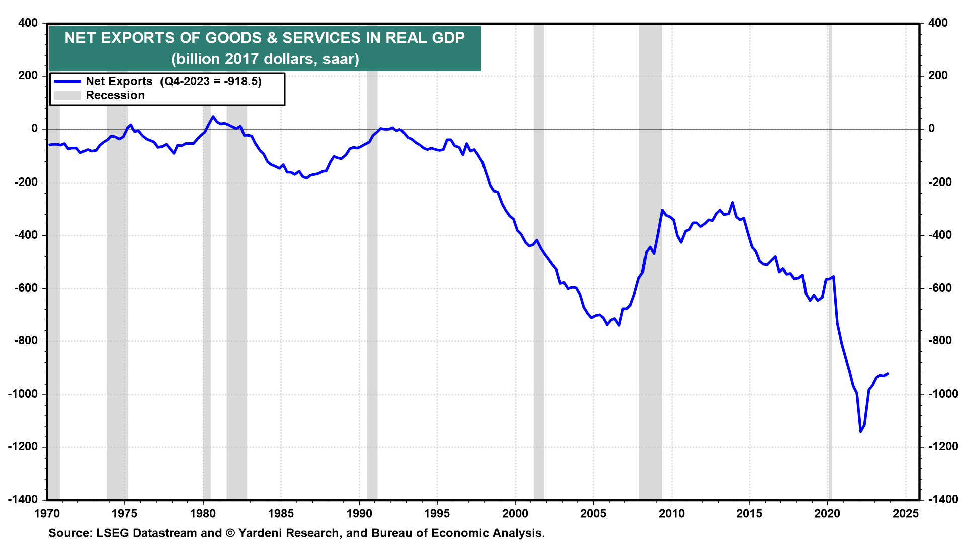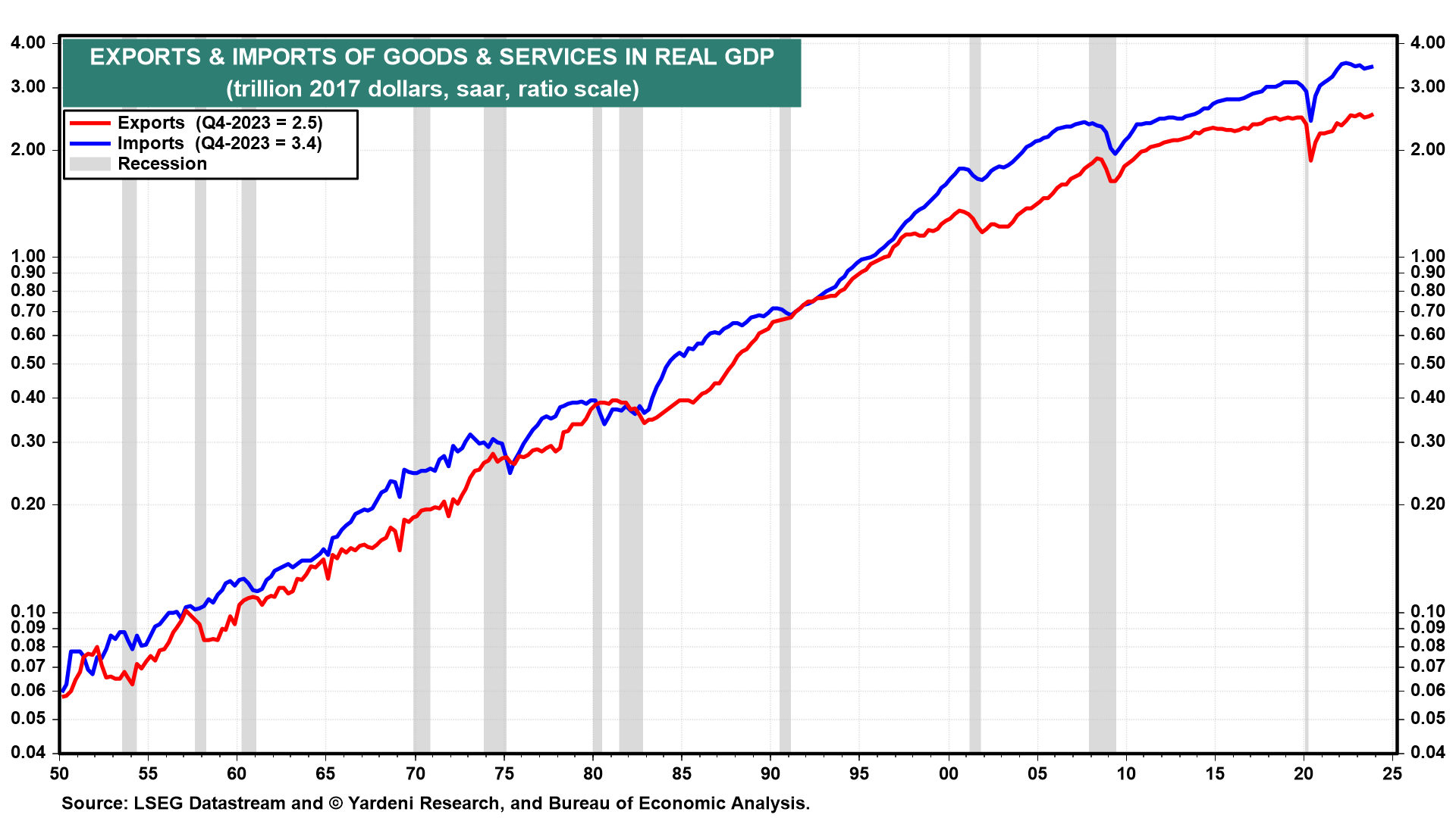 (4) Trade. The widening trade deficit in real GDP was a major drag on economic growth during the pandemic period from Q3-2020 through Q1-2022 (Fig. 10 below). That’s when Americans went on a buying binge for goods, with many of the goods purchased imported from overseas. The trade deficit has been mostly a positive contributor to economic growth since then, though not so much last year, as both exports and imports stagnated, reflecting slower global economic growth (Fig. 11 below).