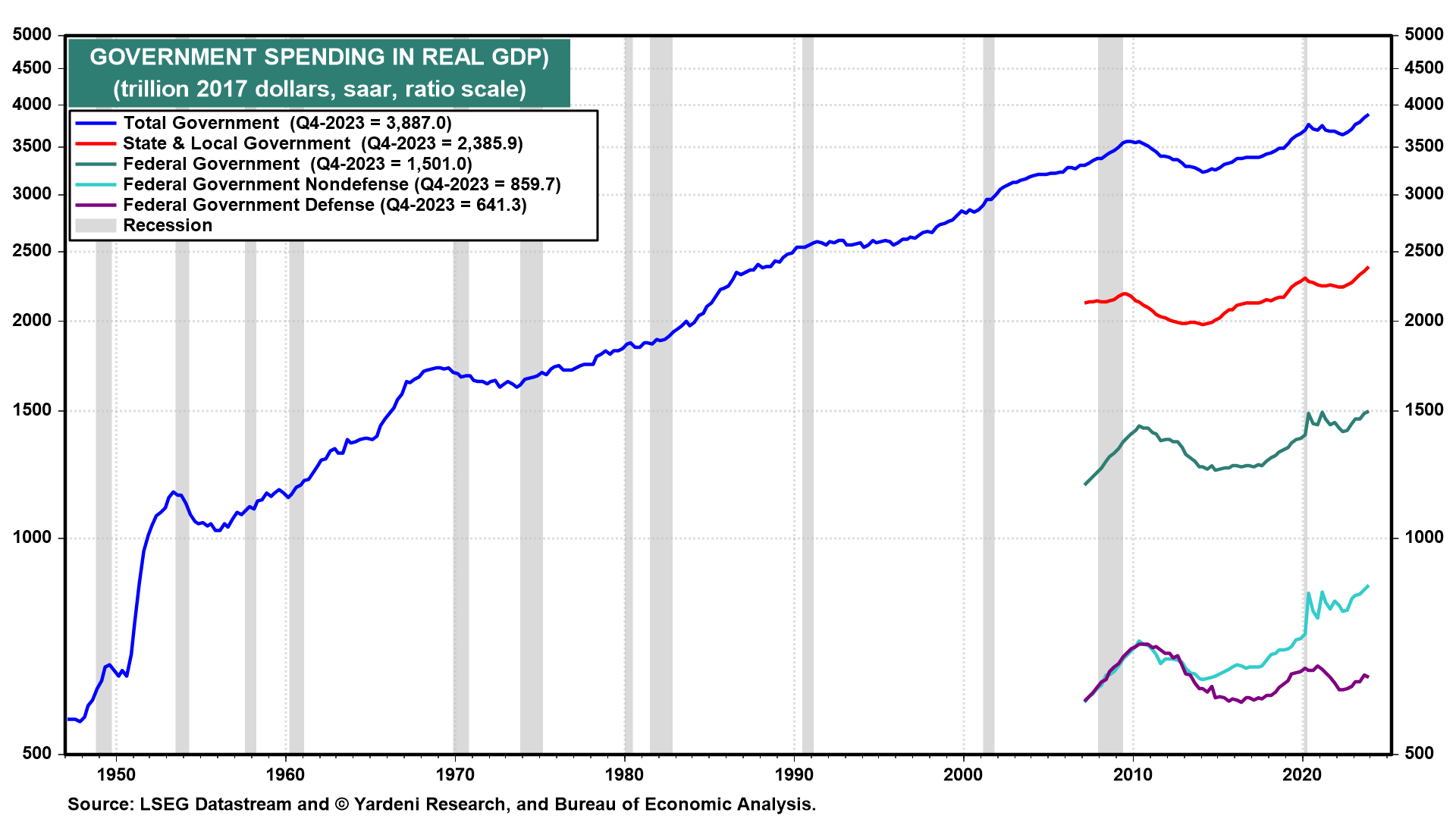 (5) Government. Federal, state, and local government spending on goods and services in real GDP rose to a record high during Q4-2023, as state and local government spending rose to new record highs while federal climbed back to its preexisting record high (Fig. 12 below). Nondefense federal government spending also rose to a record high. Spending on public infrastructure undoubtedly boosted government spending and should continue to do so.
