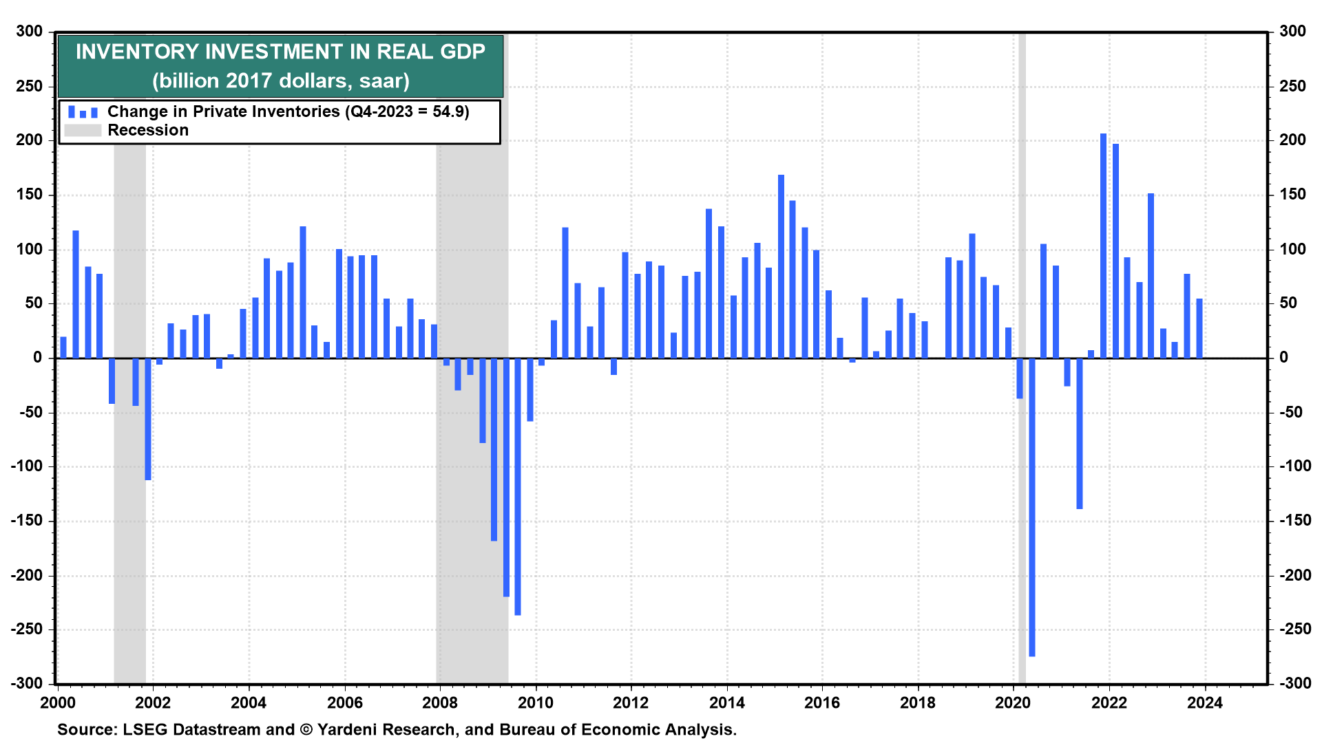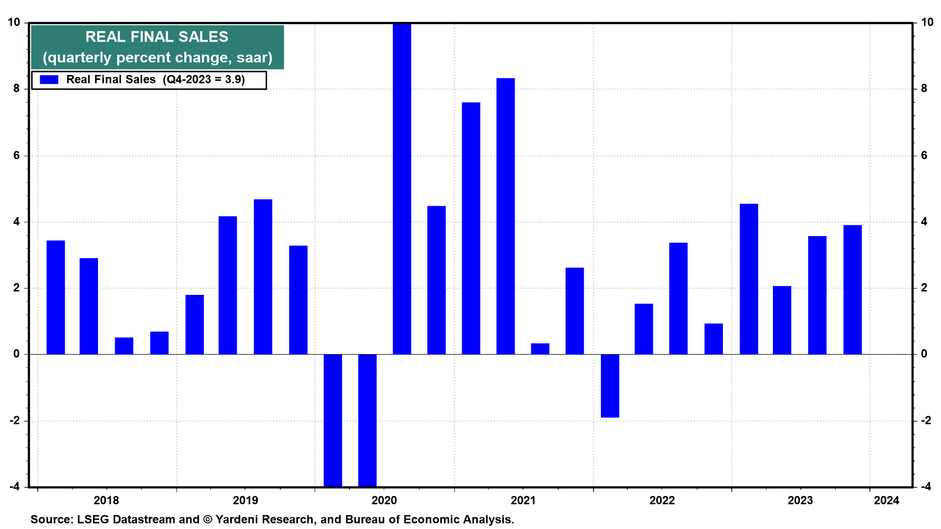 (6) Inventories & final sales. The pace of real inventory investment slowed during Q4-2023 (Fig. 13 below). That was a negative contributor to real GDP. That’s why real final sales rose 3.9% during the quarter, the best pace since the first quarter of last year (Fig. 14 below).