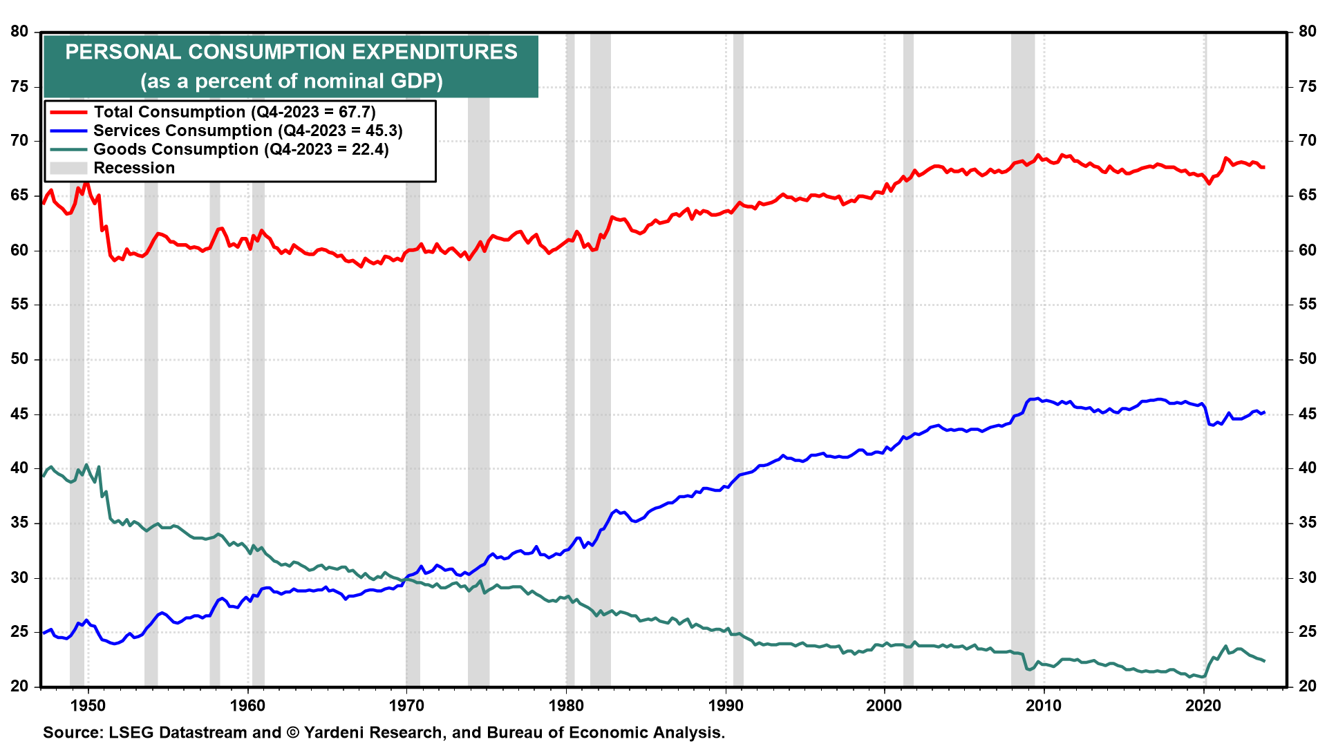 (2) Consumption. The consumer is the economy’s 800-pound gorilla. Consumer spending currently accounts for 67.7% of nominal GDP (Fig. 3 below). The percentage of services consumption rose to equal 29.9% during Q1-1970, at the same time as the percentage of goods consumption fell to that level. Today, the percentages are 45.3% for services and 22.4% for goods.