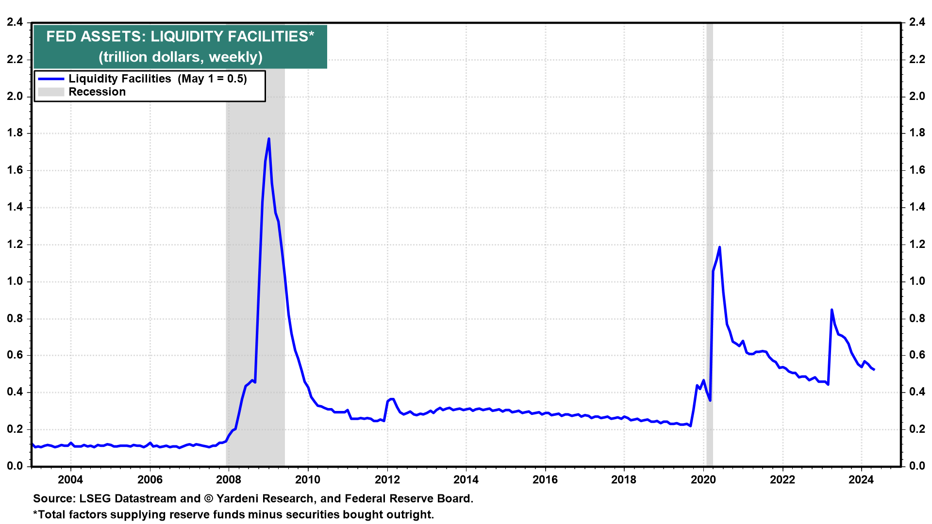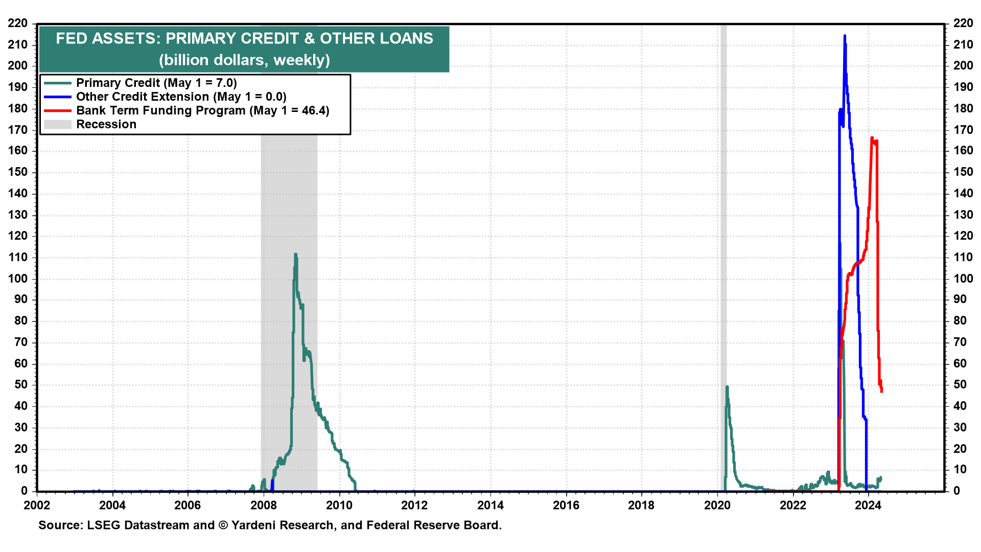 That hasn’t happened so far during the latest round of tightening. There was a financial crisis last year in March. But it turned out to be a mini-banking crisis limited to three banks because the Fed responded rapidly by establishing an emergency banking facility—the Bank Term Funding Program—that contained the crisis quickly, thus averting a credit crunch and a recession (Fig. 2 below). The program was terminated on March 11.