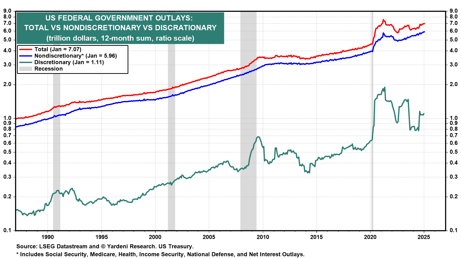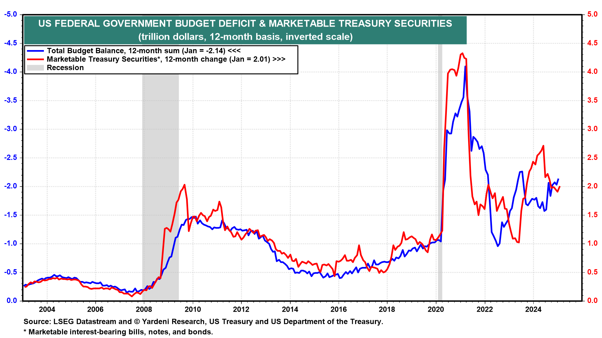 (2) October 27, 2024. Elon Musk first declared that DOGE would cut $2 trillion from the federal budget on October 27, 2024, during a Trump rally at Madison Square Garden. Over the 12 months through January, the federal government’s budget deficit totaled $2.14 trillion (Fig. 3 below).