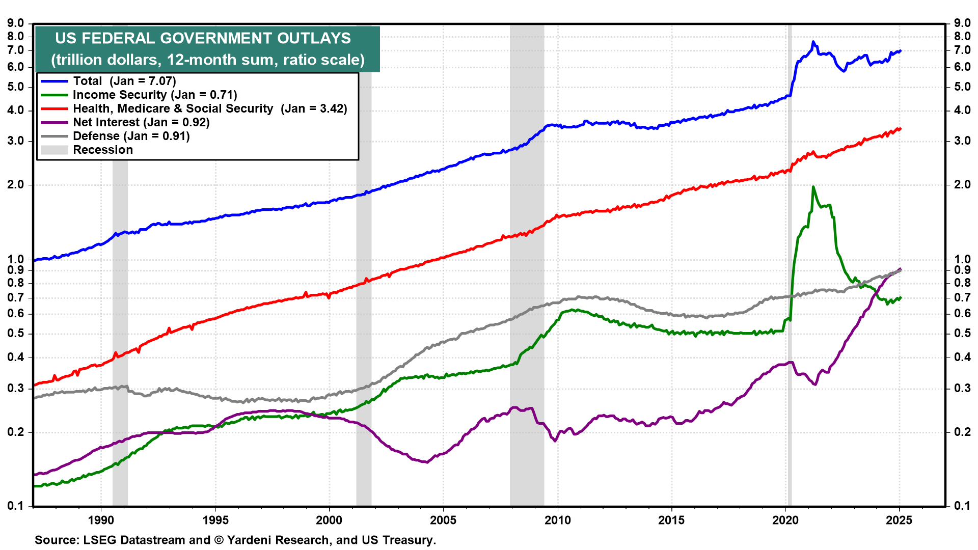 (3) January 8, 2024. However, on January 8, 2025, Musk stated in an interview with Mark Penn that achieving the $2 trillion cut was unlikely and that the best-case outcome would be around $1 trillion. Over the past 12 months through January, federal government outlays totaled $7.1 trillion, with $6.0 trillion in mandatory outlays (including Social Security, Medicare, health, income security, national defense, and net interest) (Fig. 4 below). Net interest outlays alone totaled $920.6 billion, exceeding the $910.2 billion spent on defense over the last 12 months (Fig. 5 below).