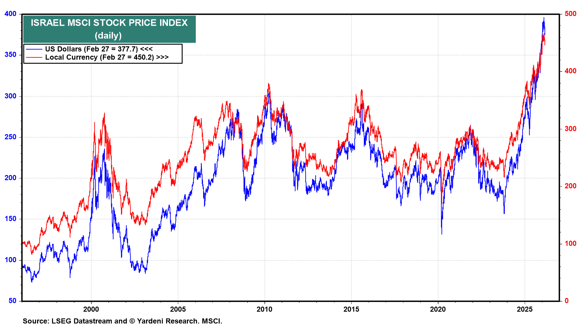 In the Middle East, the terrorist proxies of Iran’s Mullahs in Gaza (Hamas), Lebanon (Hezbollah), and Yemen (Houthis) have already been decapitated once by the Israelis. Now they’ve lost their puppet master in Tehran. The Abraham Accords are likely to be expanded to include more Arab countries. The Israeli stock market has been discounting this scenario for the past two years (Fig. 2 below).
