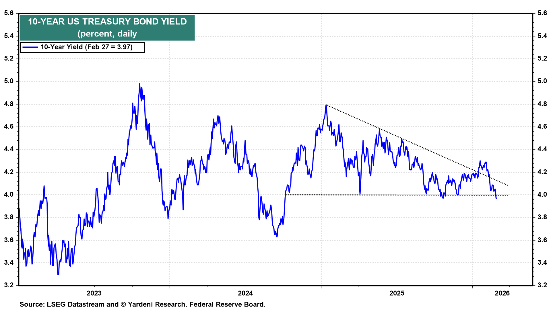 Geopolitics II: What About Interest Rates? On Friday, despite mounting evidence that another conflict in the Middle East was imminent, the 10-year Treasury bond yield fell below 4.00% (Fig. 9 below). That happened even though January’s PPI inflation rate was hotter than expected (Fig. 10). Furthermore, the January 27-28 FOMC minutes, released on February 18, were relatively hawkish, with some members of the monetary-policy committee explicitly raising the possibility of rate hikes assuming that there are no clear indications that disinflation is firmly on track. At the time of the meeting, the bond yield was at 4.25%.