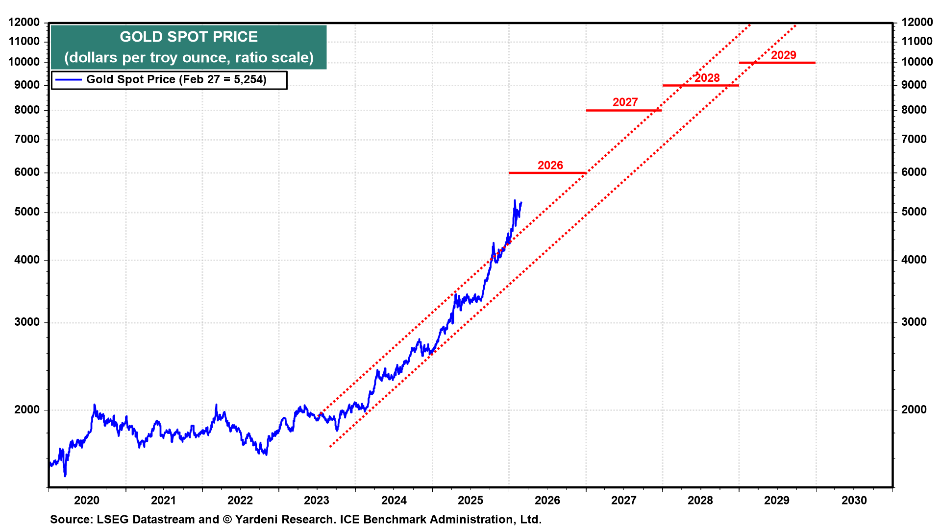 (1) Our Roaring 2020s base-case scenario remains at 60%. If the postwar outcome of our short-war scenario plays out, oil prices will be lower. Consumer confidence, purchasing power, and spending will get a boost from lower oil prices and greater stability in the Middle East. The odds of a recession and a bear market would remain low. Corporate earnings would continue to rise as both the US and global economies benefit from lower oil prices (Fig. 16). Our Roaring 2020s targets for the S&P 500 remain intact at 7,700 by the end of this year and 10,000 by the end of 2029 (Fig. 17). The Roaring 2020s would be followed by the Roaring 2030s.