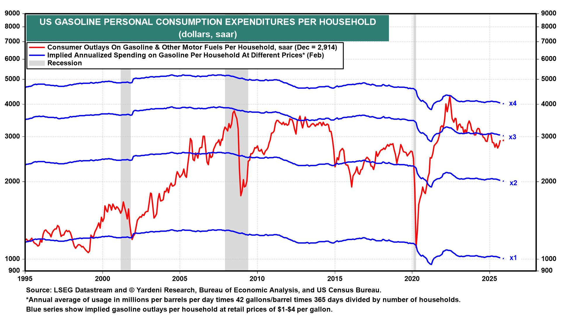 In any event, oil prices are likely to fall in the coming months, assuming this war is short, as it’s bound to be. That should help to bring US headline inflation down to the Fed’s 2.0% y/y target. Lower gasoline prices will boost consumers’ purchasing power in the US and around the world (Fig. 5 below). Both US and global economic growth should benefit from lower oil prices. After an initial negative reaction to the war, stock markets around the world should resume setting record highs, especially in oil-importing countries throughout Asia (Fig. 6). So most emerging economies’ stock markets should continue to outperform (Fig. 7).