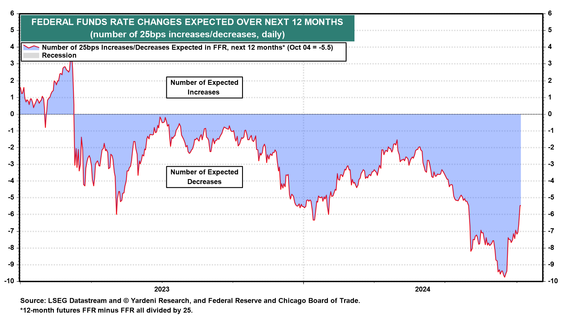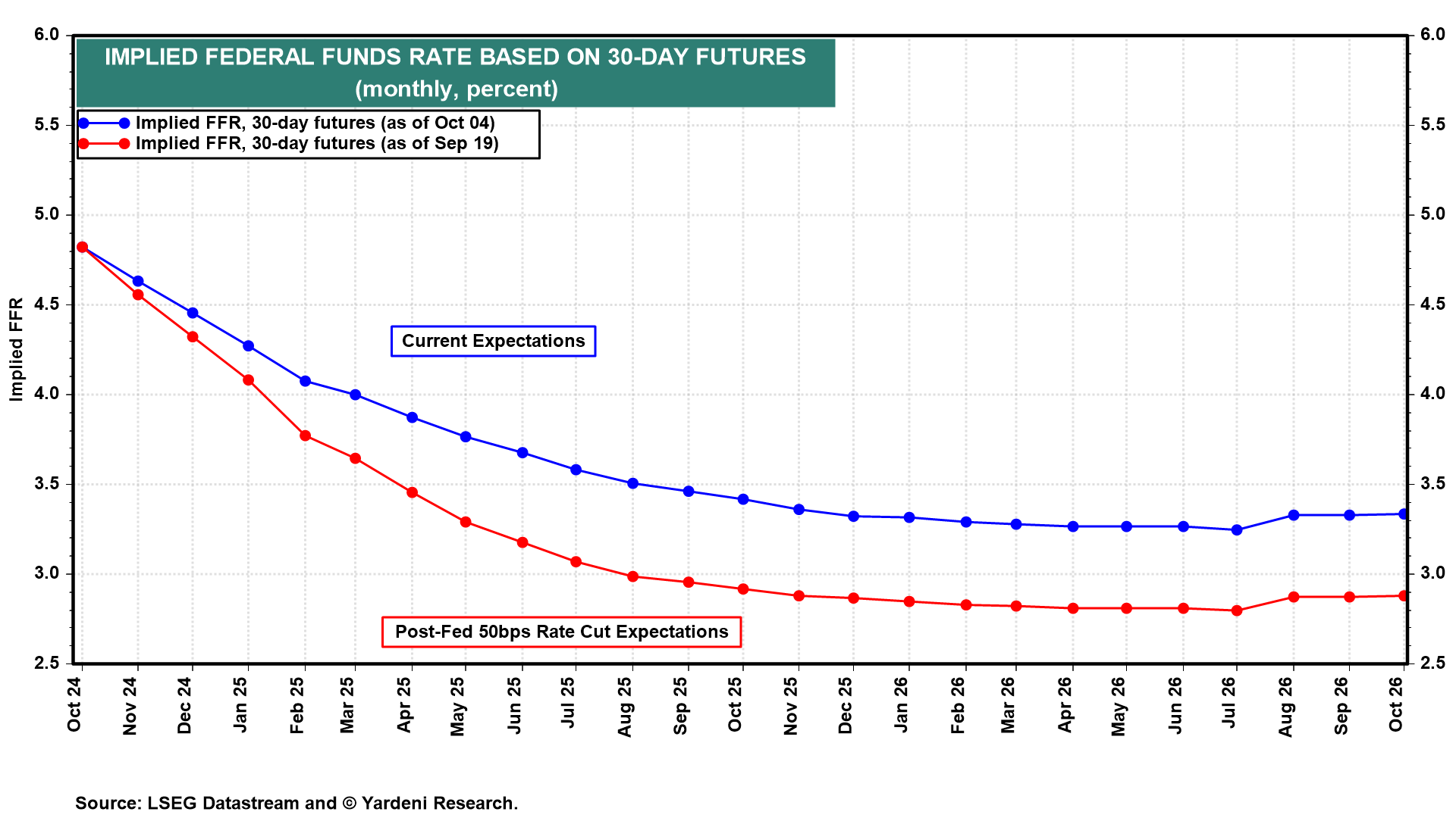 Even so, the next day the FFR futures market indicated another seven cuts of 25bps in the FFR over the next 12 months, including another 50bps of rate cuts by the end of the year (Fig. 2 below). Again, that made no sense to us since we believed that the summer’s economic weakness was just a soft patch, and didn’t require an aggressive Fed easing response.