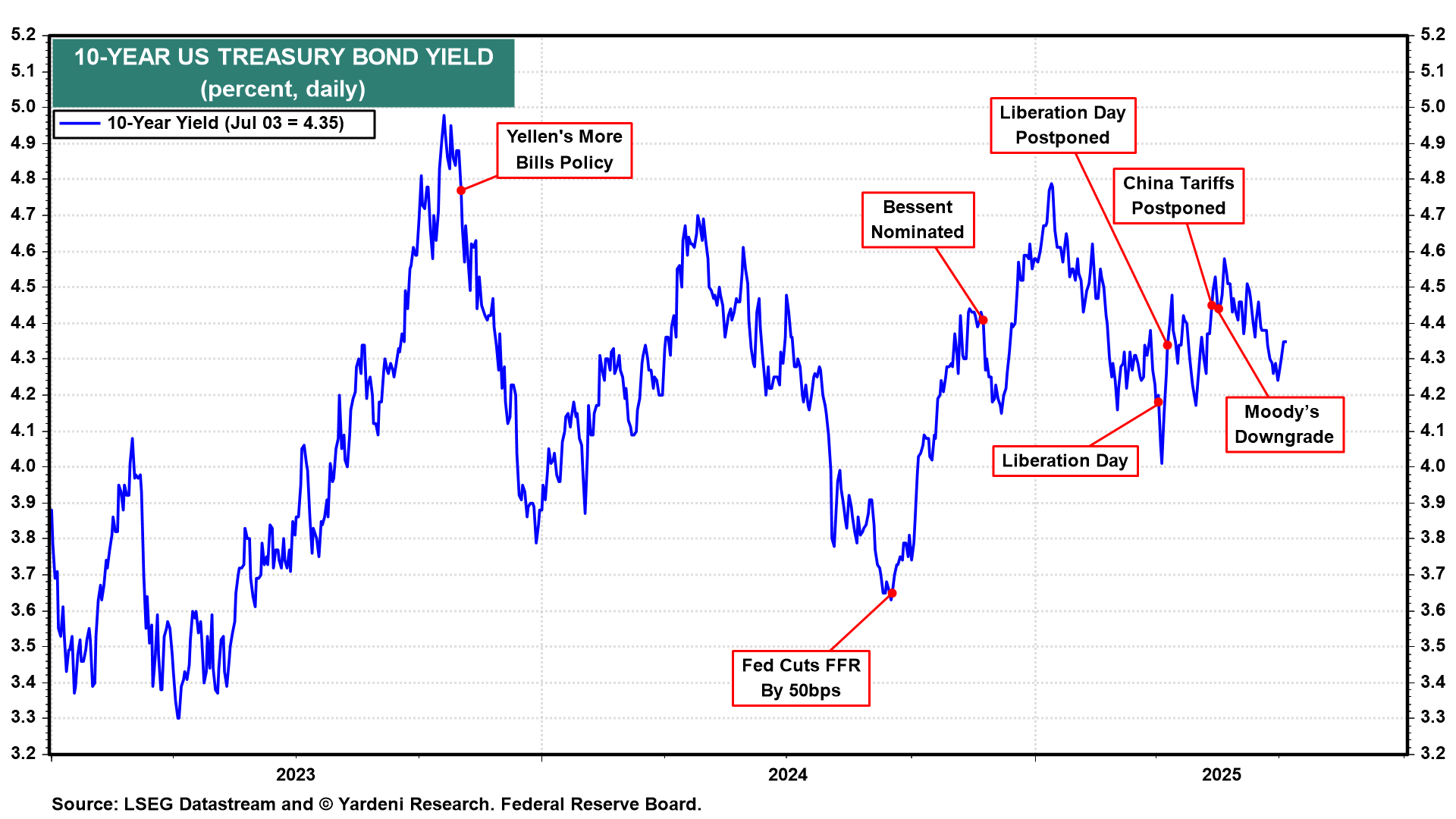 Trump has also been frustrated by the Bond Vigilantes. On April 9, he was forced to postpone imposing his April 2 “Liberation Day” reciprocal tariffs on America’s trading partners for 90 days after bond yields spiked on the resulting turmoil in the capital markets (Fig. 1 below). He acknowledged as much that same day (April 9) when he said, “I was watching the bond market. The bond market is very tricky; I was watching it. But if you look at it now, it’s beautiful. The bond market right now is beautiful. ... I saw last night where people were getting a little queasy.”
