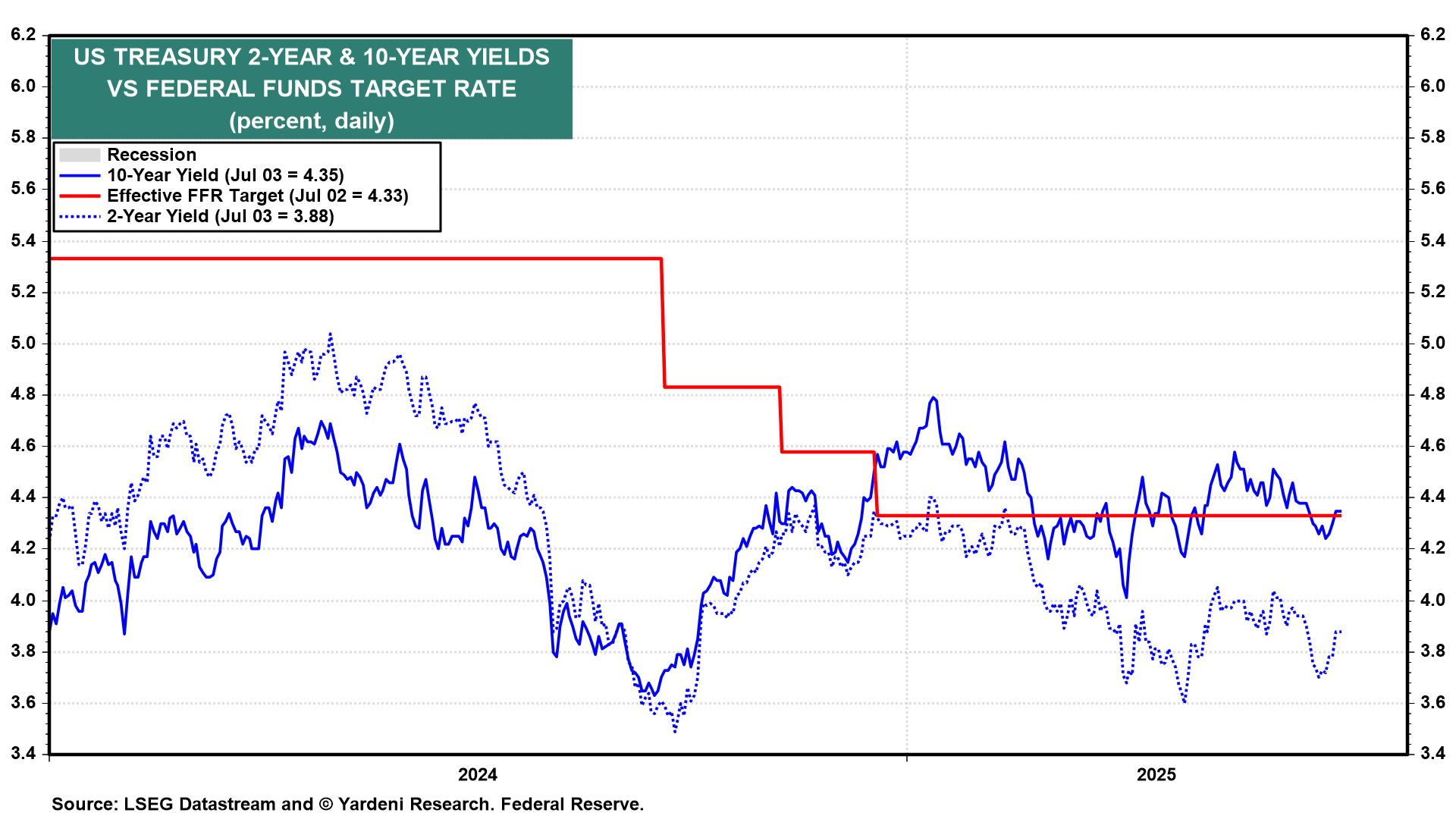 (1) Fed Chair Jerome Powell’s term as Fed chair expires on May 15, 2026. However, he could stay on as a Fed governor until his term in that position expires on January 31, 2028. Fed Governor Adriana D. Kugler’s term expires on January 31, 2026. Trump could fill her open position with someone outside the current Fed roster, such as Treasury Secretary Scott Bessent or another Trump loyalist, including current Fed Governor Christopher Waller.