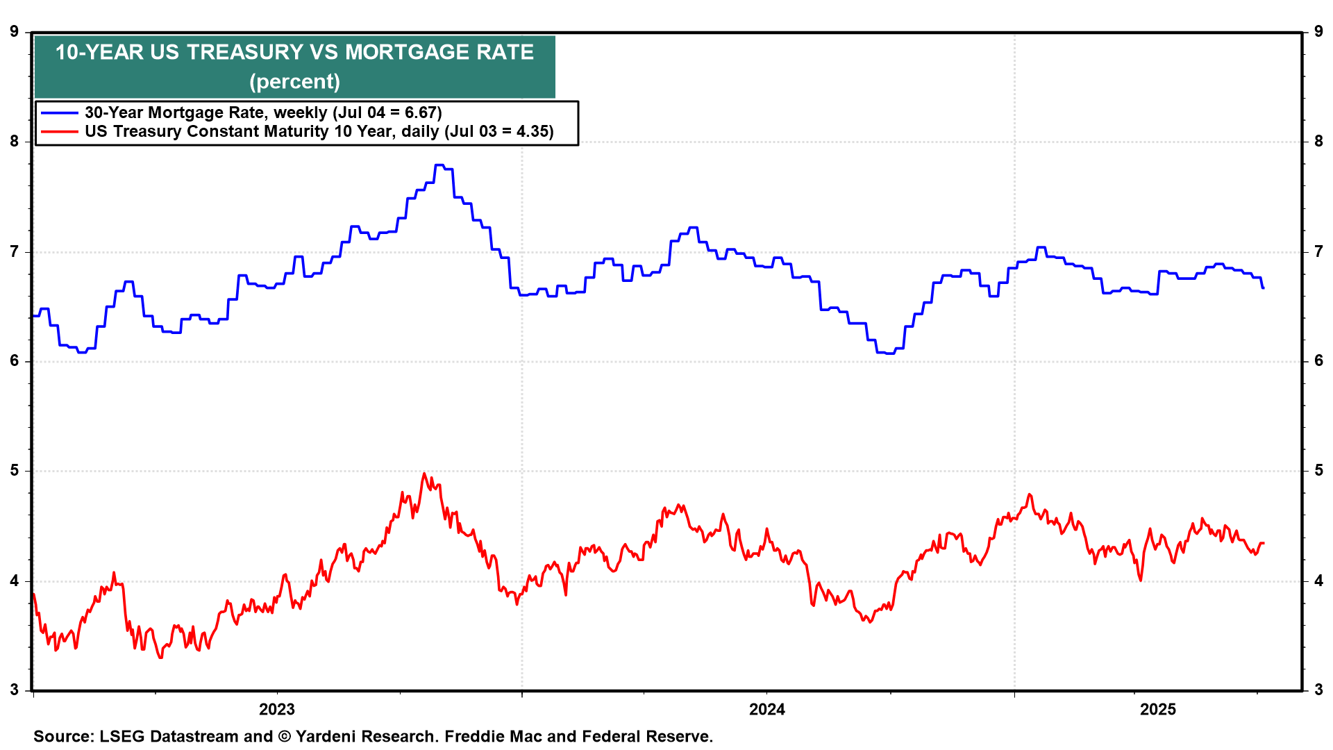 That’s what happened last year from September through December when the Fed cut the federal funds rate four times by 100bps in total (Fig. 2 below). The 10-year bond yield (and mortgage rates) rose by 100bps (Fig. 3 below). The Bond Vigilantes recognized that the economy wasn’t as weak as Fed officials thought at the time. We did too, and we predicted that the bond yield would rise in response to the Fed’s unwarranted easing.