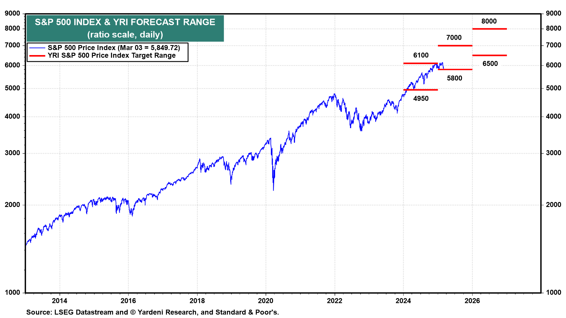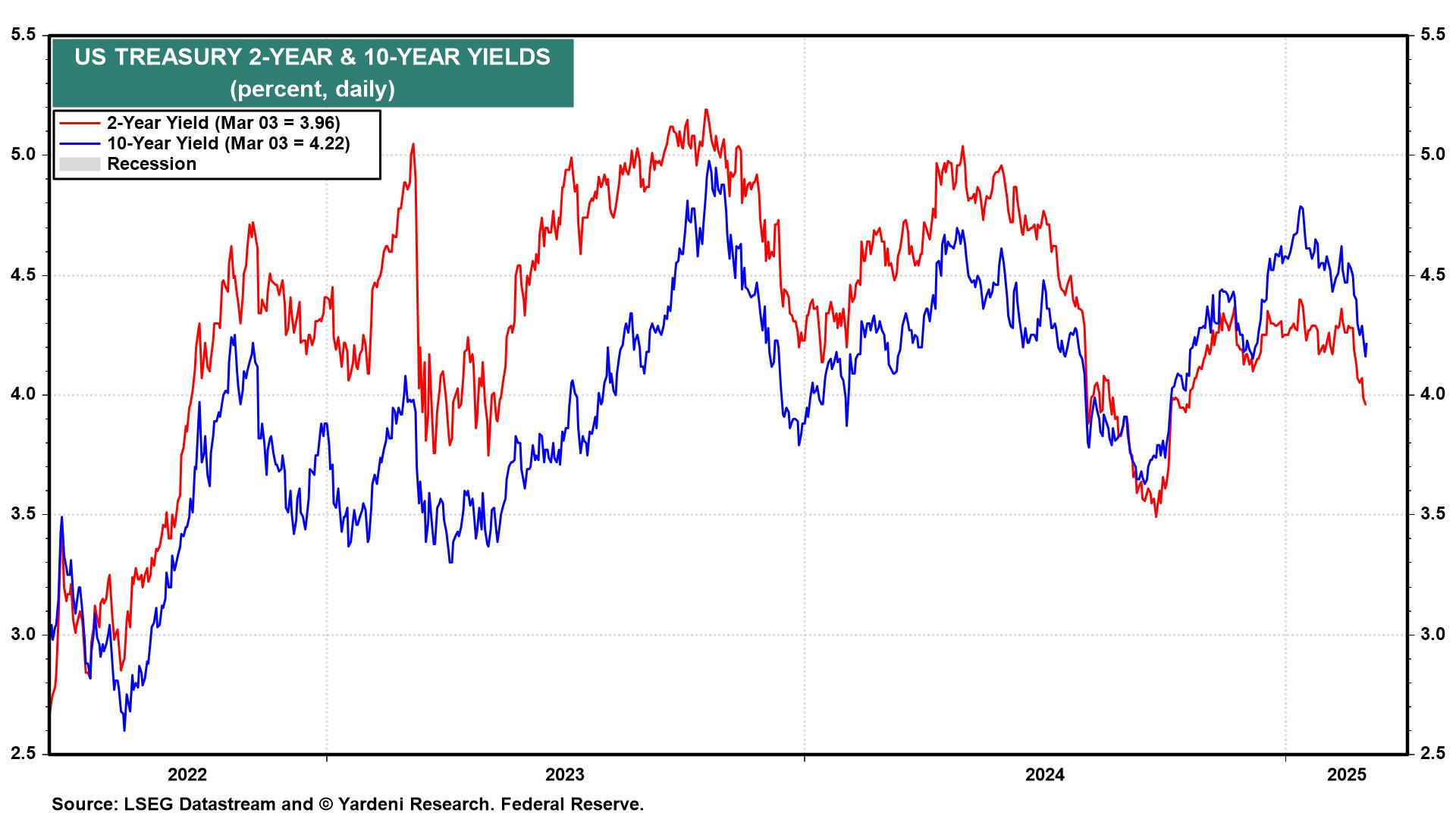 Over the past couple of years, the risk of a federal government debt crisis also rose a few times along with bond yields. But now the 10-year US Treasury yield is down from a recent high of 4.79% on January 13 to 4.24% today. That’s despite signs that Trump Tariffs 2.0 are already boosting expected and actual inflation. Bond investors are giving more weight to the “stag” than the “flation” components of a stagflation scenario. We are doing the same by raising the odds of a tariff-induced recession from 20% to 35%.