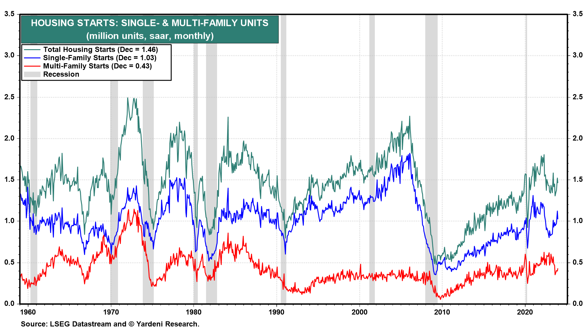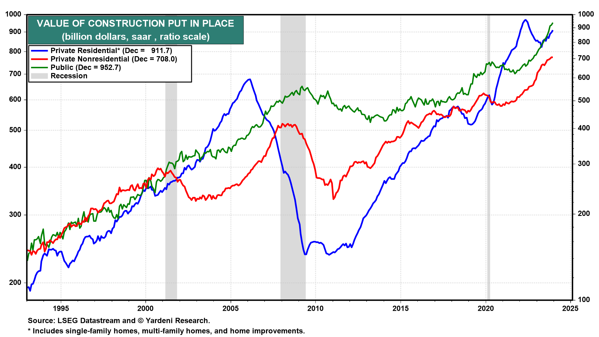 (2/10) Monetary policy matters more than fiscal policy. While most economists obsessed about the tightening of monetary policy, they mostly ignored the stimulative impact of fiscal policy. Legislation passed in 2022 provided a big boost to spending on public infrastructure and manufacturing facilities and provided tax incentives for such construction. As a result, private nonresidential and public construction soared to record highs over the past two years, and so did total payroll employment in the construction industry (Fig. 10 below and Fig. 11).
