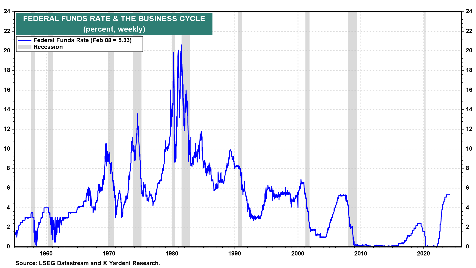 (1/10) Tight monetary policies always cause recessions. The Fed raised the federal funds rate (FFR) by 525bps to 5.25%-5.50% from March 2022 through July 2023. That’s the most aggressive round of rate hikes since the late 1970s, when then-Fed Chair Paul Volcker let the FFR soar (Fig. 7 below). The past 10 recessions were preceded by a series of rate hikes.