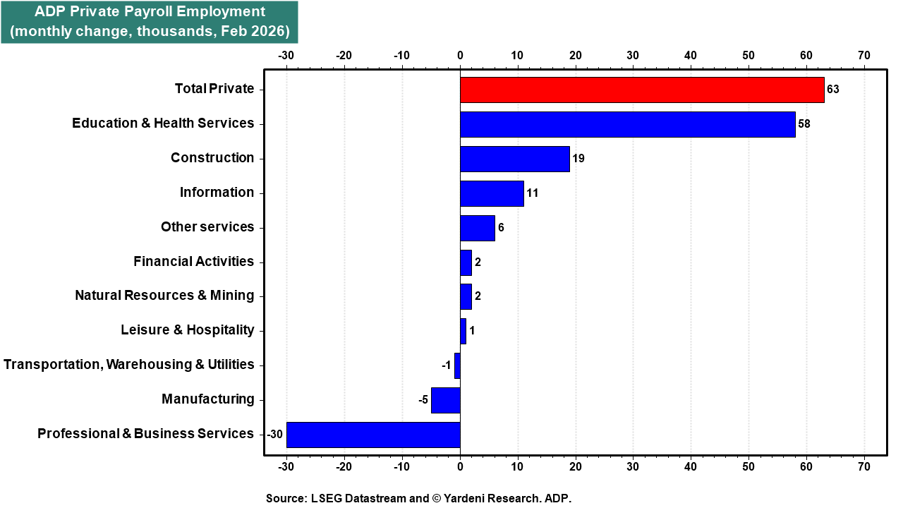 February's ADP report showed that private payrolls increased by 63,000, beating expectations (chart). Hiring strength was concentrated in services, particularly education and health services, which added 58,000 jobs. Construction employment continues to pick up, reflecting the data center buildout, while manufacturing employment declined modestly. Professional & business services payrolls fell by 30,000. Job growth was driven primarily by small businesses, which added 60,000 jobs.