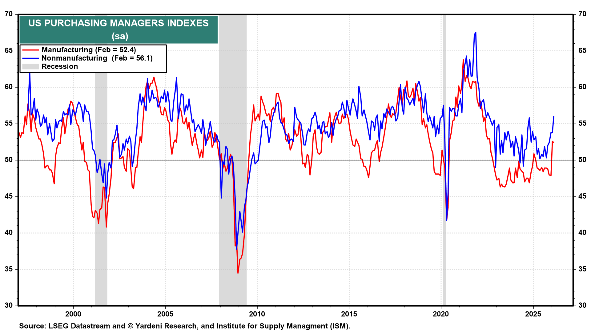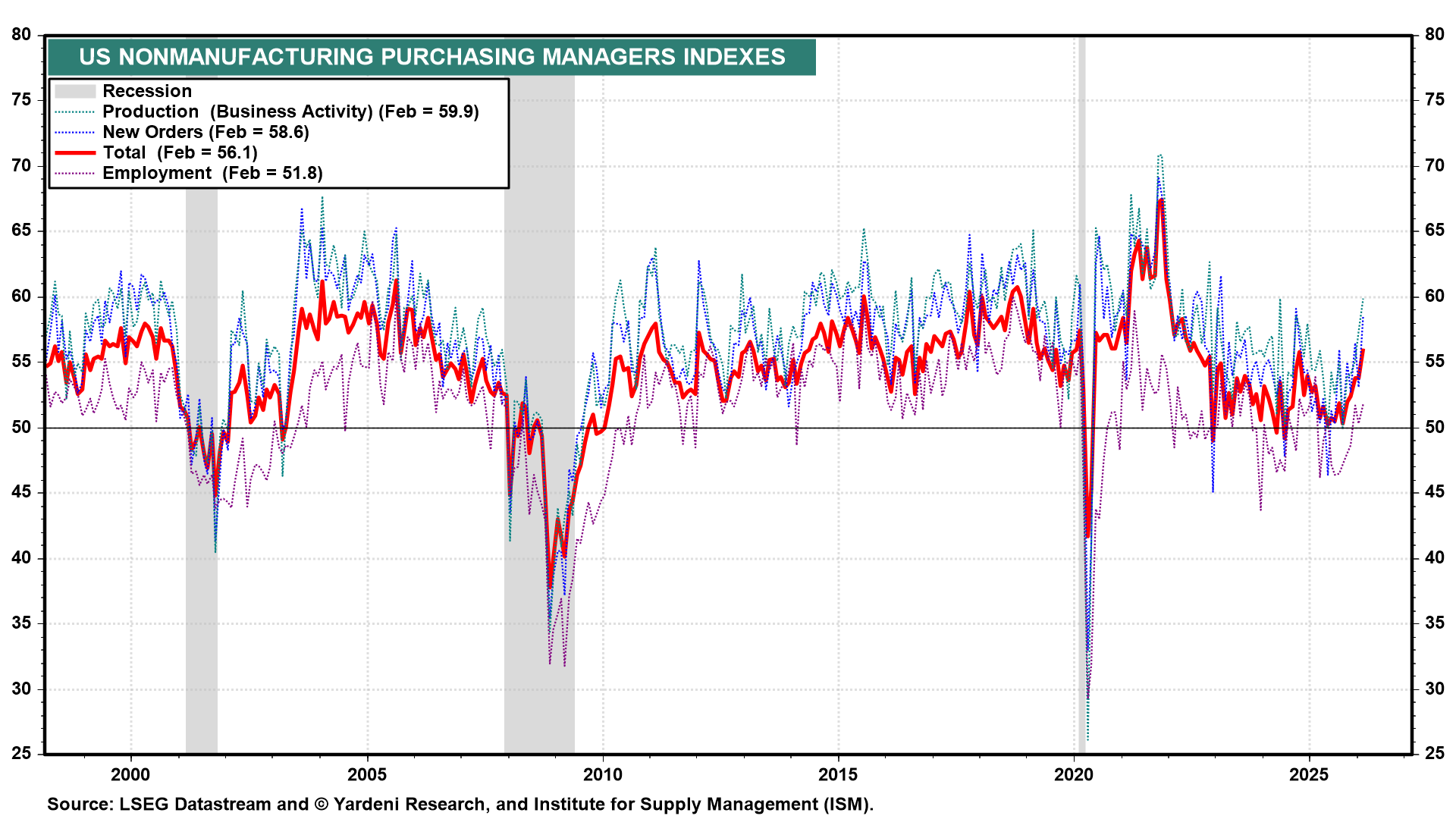The services sector continues to lead the economy. The non-manufacturing PMI registered a very solid 56.1 in February (chart), with production and new orders the highest since 2024. Given that services account for the majority of US economic output, the strength of the index suggests the broader economy remains resilient despite pockets of uncertainty reported in the Beige Book, including more price-sensitive consumers and some pullback in lower-income spending.