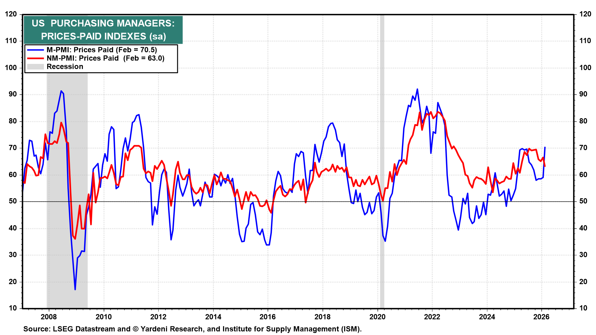 Inflation pressures picked up in manufacturing during February, according to the manufacturing prices-paid index, which rose sharply to 70.5 (chart). That's up from 59.0 in January and the highest level since June 2022, reflecting rising input costs for materials such as aluminum and steel. Meanwhile, the non-manufacturing prices-paid index eased to 63.0 (chart). That's consistent with the Beige Book's observation that firms expect prices to rise at a somewhat slower pace in the near term. Even so, both price-paid indices remain well below the extreme levels reached during the pandemic.