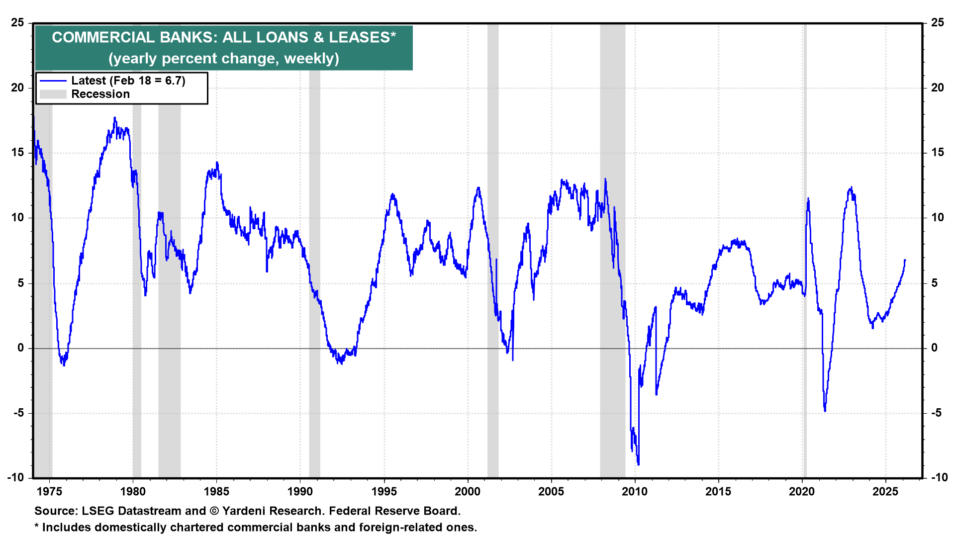 Bank lending continues to expand, with commercial banks' loans and leases rising 6.7% y/y (chart). This suggests traditional banks are expanding their lending despite concerns about stress in the private credit markets.