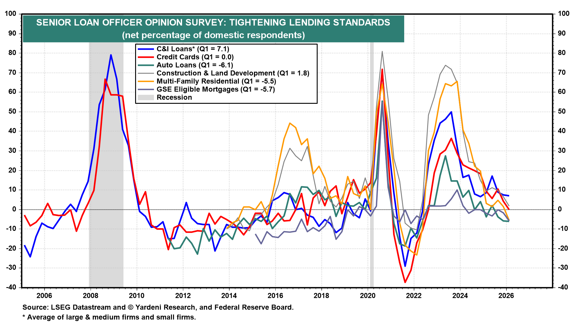 The Fed's latest senior loan officer opinion survey shows that the severe tightening in lending standards during 2022–23 has eased across all major loan categories (chart).