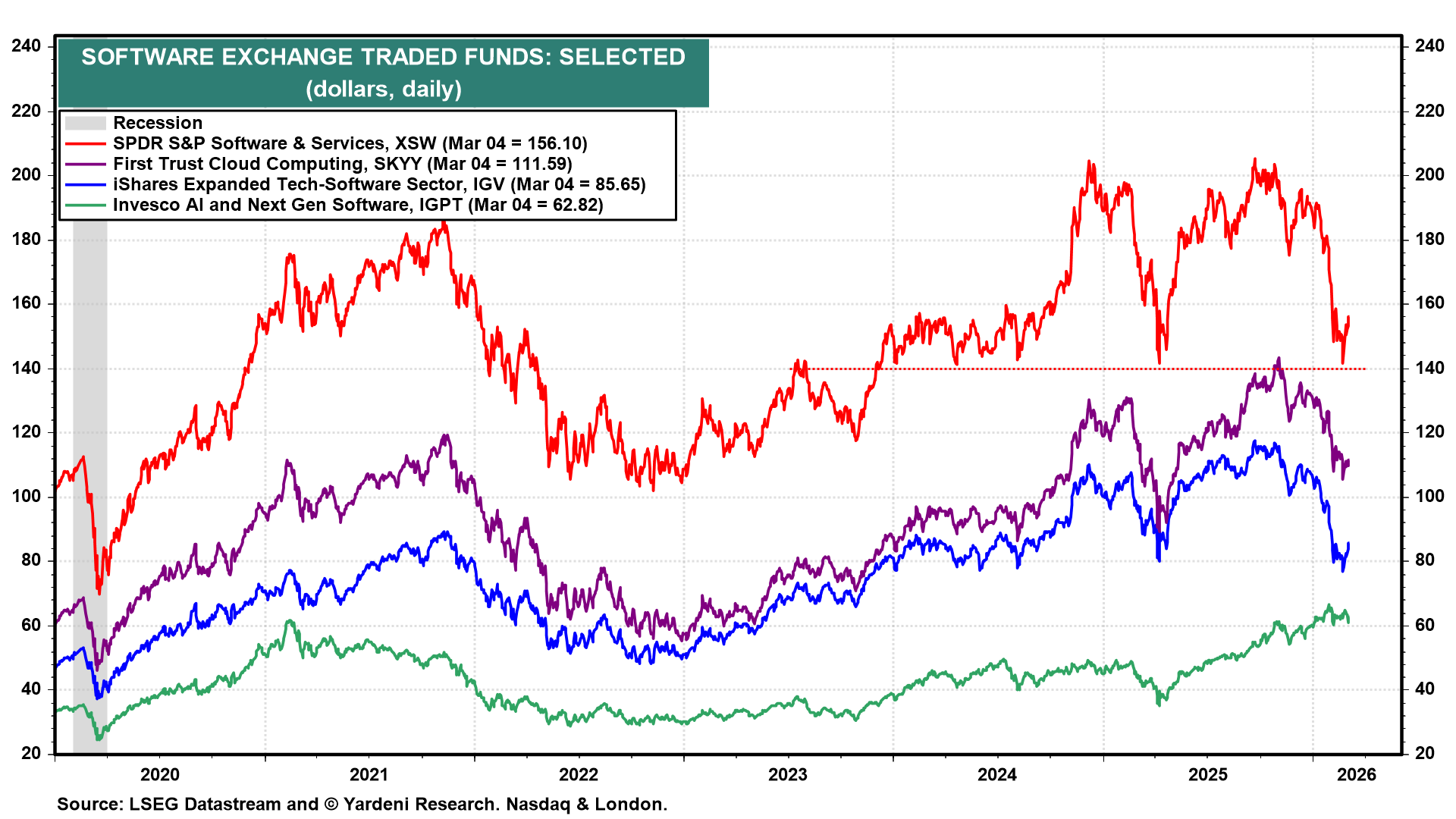 Recently, equity investors have been concerned that AI coding could disrupt the software industry. However, software ETFs appear to have found technical support during the latest bout of market volatility (chart). Despite the broader market's selloff on geopolitical fears, several major software ETFs stabilized and bounced yesterday and today, suggesting investors are done rerating the software stocks and regaining some confidence in their longevity.