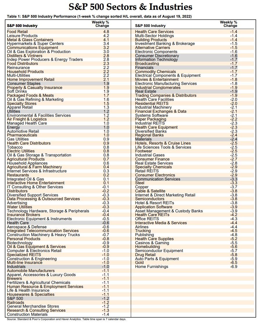 Last week's market moves suggest that traders are bracing for a mostly hawkish speech from Fed Chair Jerome Powell at Jackson Hole on Friday. That's evident in the following table showing last week's performance of the 11 sectors and 100+ industries in the S&P 500. The winners were the risk-off laggards since June 16, while the losers were the risk-on leaders since then.