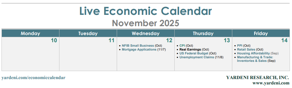 (1) CPI Inflation. The Cleveland Fed's Inflation Nowcasting shows that the headline and core CPI inflation rates rose 2.96% and 2.99% y/y, respectively, in October. In recent months, the CPI core inflation rate has been stuck around 3.00% (chart).