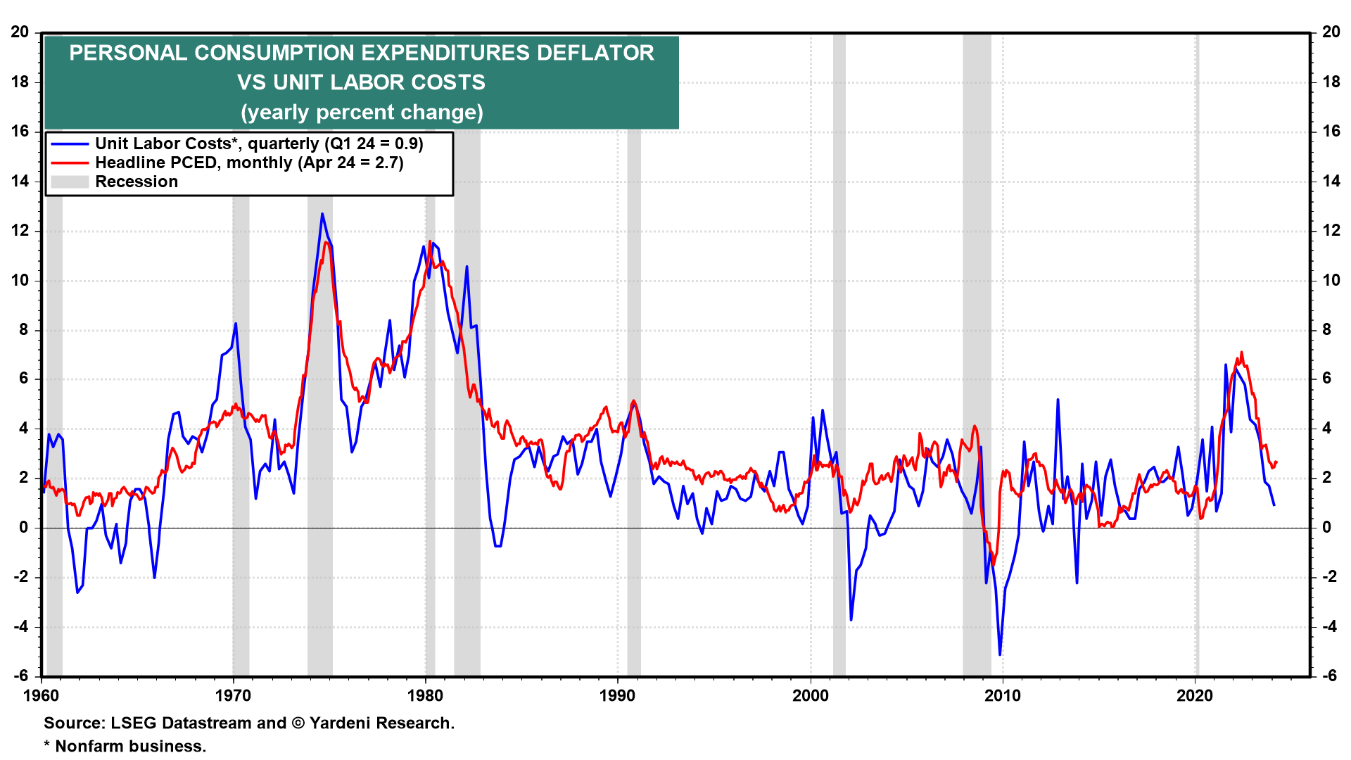 (2) Productivity & labor costs. Q1's unit labor costs (ULC) was revised down to 4.0% (q/q, saar) from 4.7% as hourly compensation was revised down from 5.0% to 4.2%. ULC for Q4-2023 was also revised much lower, to -2.8% from 0.0%, as hourly compensation was slashed from 3.5% to 0.6%!