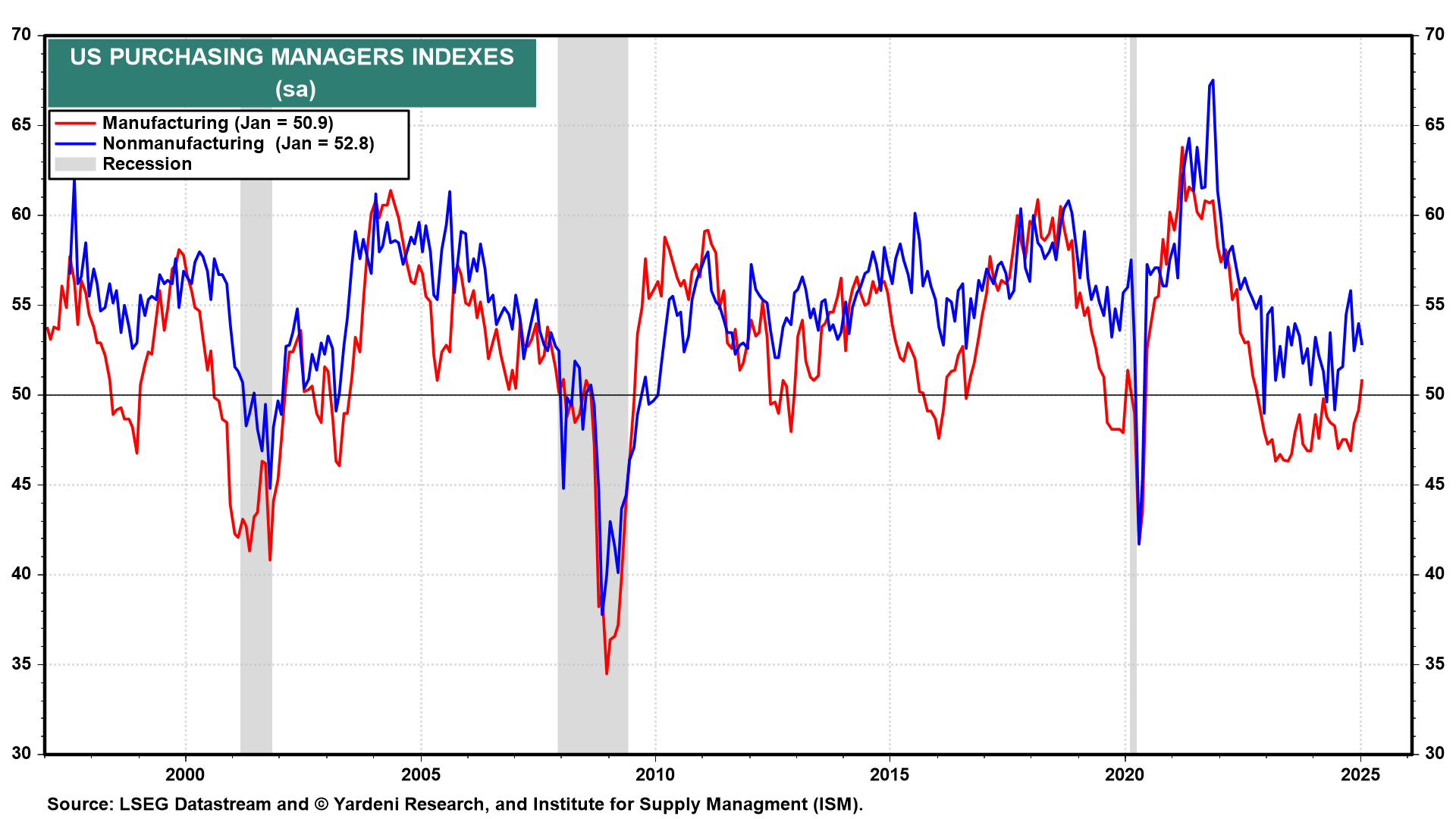(1) Manufacturing. After contracting for nearly the entire post-pandemic period, the ISM M-PMI suggests that the manufacturing sector is starting to expand (chart).