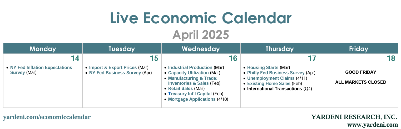 The economic week ahead will provide updates on the goods-producing sector, consumer spending, and inflation. Macroeconomic data may be drowned out by more explosive volatility in the financial markets attributable to Trump's Nitro Tariffs (TNT). In addition, the Q1 earnings season has started, and company managements are likely to provide lots of "we-have-no-idea" guidance as a result of TNT.