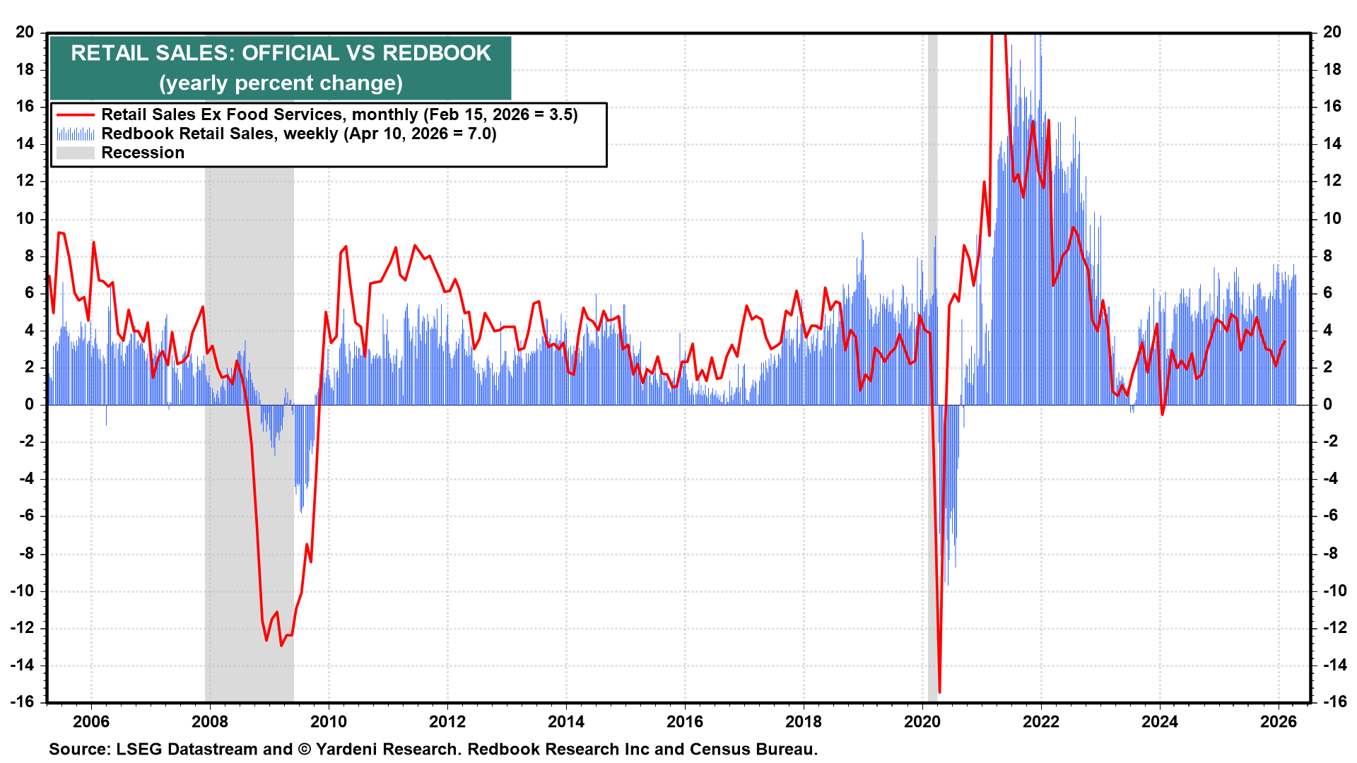 The weekly Redbook Retail Sales index suggests that the pace of consumer spending at retail stores remained solid during March and April (chart).