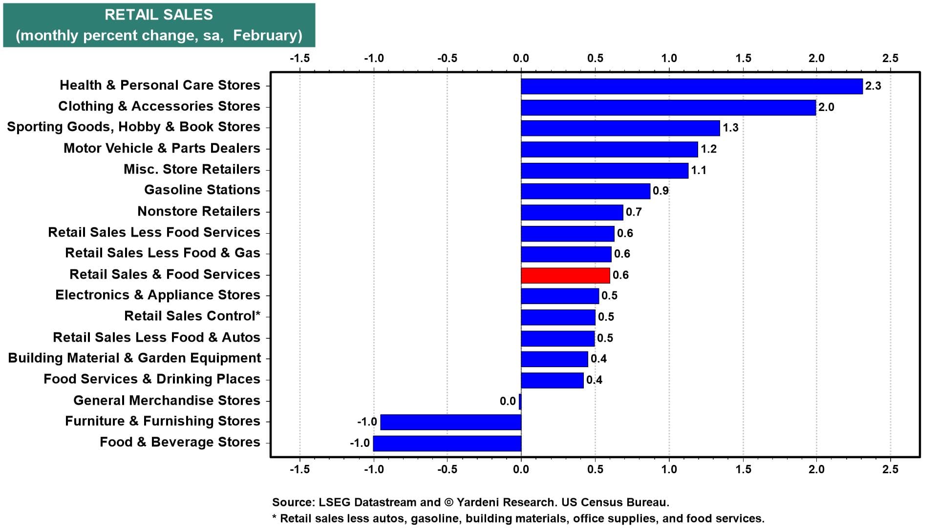 (1) Retail sales. March retail sales (Tue) will be the first hard data on consumers since the war started. Despite winter storms, February's category breakdown was unambiguously strong with health & personal care up 2.3%, clothing up 2.0%, and motor vehicles up 1.2%. Only furniture & furnishing stores and food & beverage stores were down that month (chart). The latter's weakness was probably weather related.