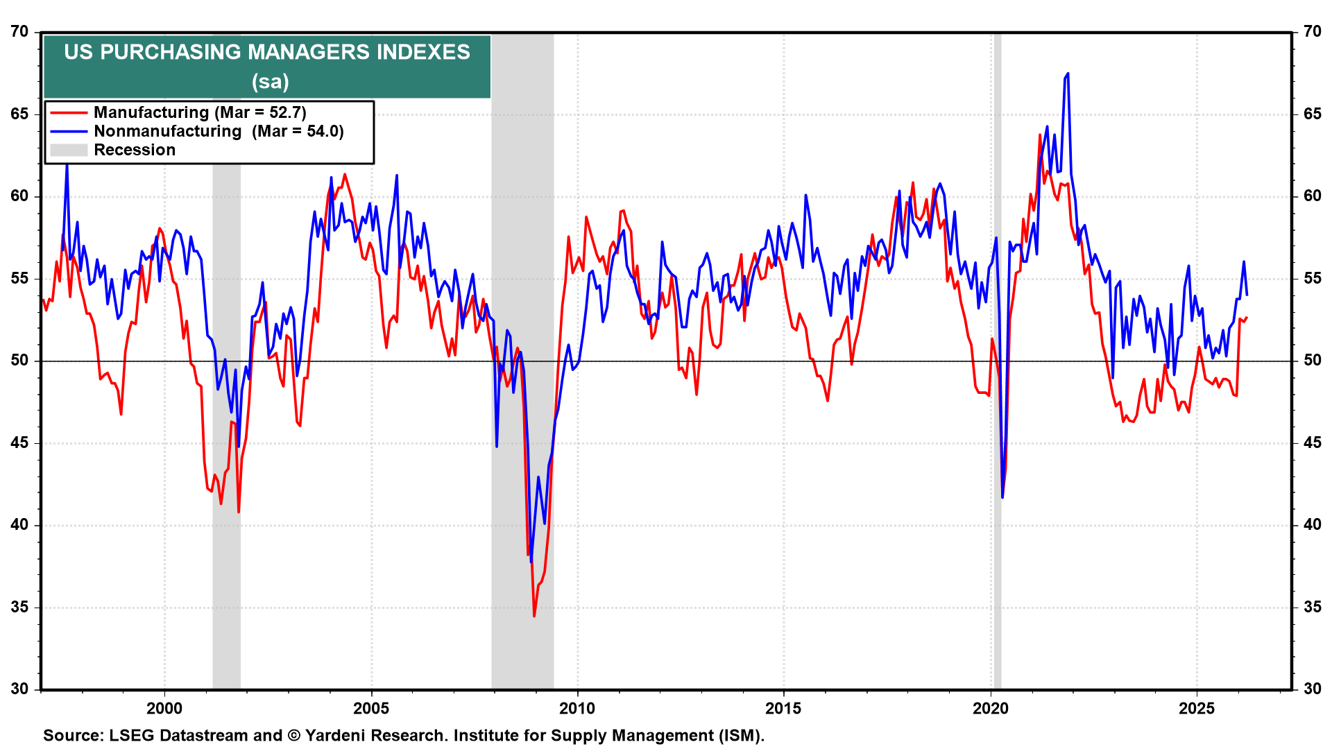 (3) Flash PMIs. The April flash PMIs (Thu) might hint at some war-related effects. March's final readings showed that manufacturing and non-manufacturing PMIs held comfortably above 50.0 at 52.7 and 54.0, respectively, and Thursday's flash will be the first April read on whether that resilience is holding (chart).