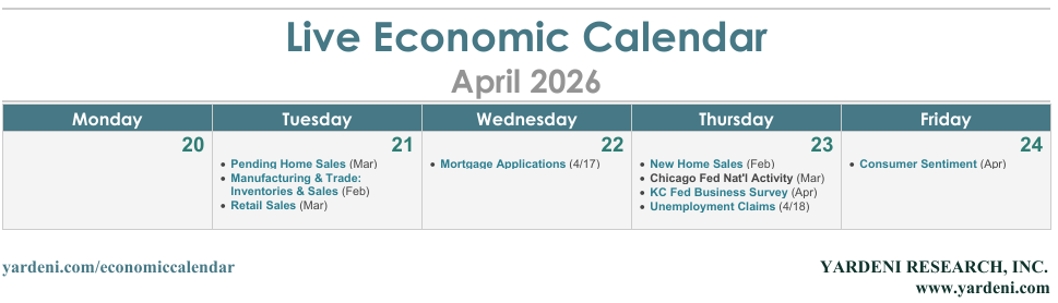 (2) Unemployment. Initial jobless claims fell to 207,000 for the week of April 10, with the four-week moving average edging up slightly to 209,800 (chart). Continuing claims ticked up to 1,818,000, though the trajectory still suggests that the duration of unemployment is shortening. Despite geopolitical uncertainties, most employers are not cutting their headcounts.