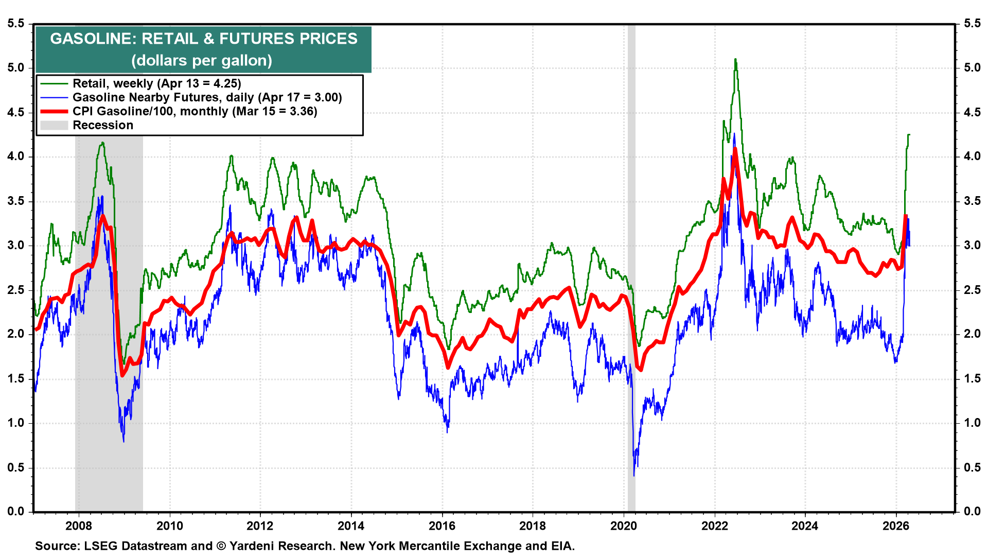 The week starts with the Strait of Hormuz still the key risk for financial markets. Today, Iranian state media said the Strait has been closed again because the US “did not fulfill their obligations.” Iran had declared it was open on Friday. A renewed US diplomatic push could send senior officials back to talks as early as Monday, but no date has been finalized, and the situation remains fluid. In the US, the average pump price remained above $4.00 during the week of April 13 (chart).