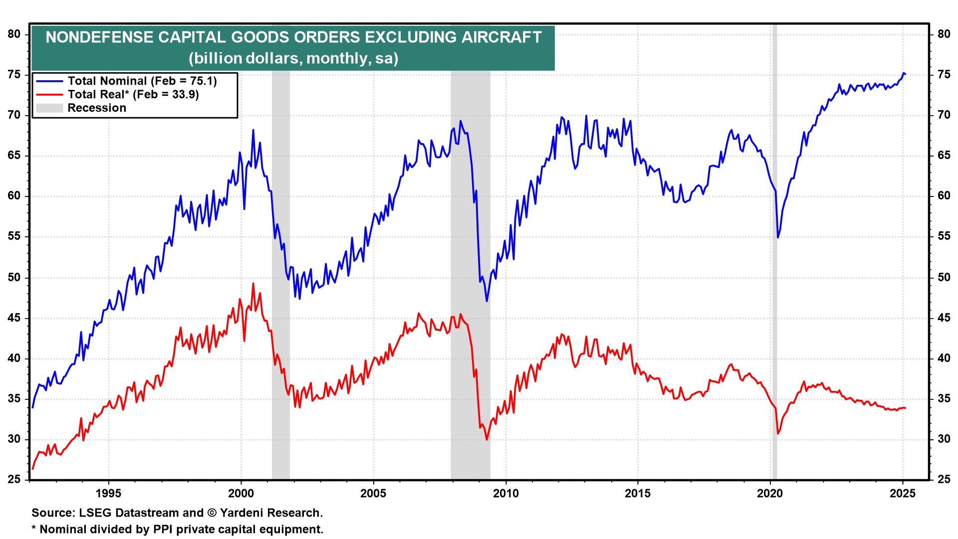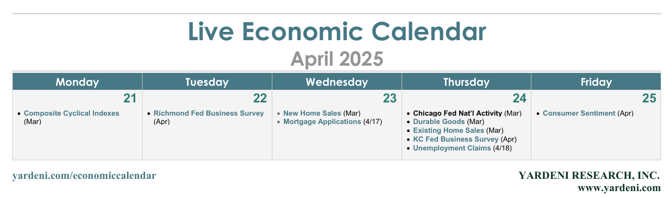 The CEI is highly correlated with S&P 500 forward earnings (chart). The CEI consists of payroll employment, real personal income (less transfers), real manufacturing and trade sales, and industrial production. So its trajectory depends on whether tariffs stimulate more American manufacturing or whether higher prices and less trade reduce overall growth in the goods-producing sector.
