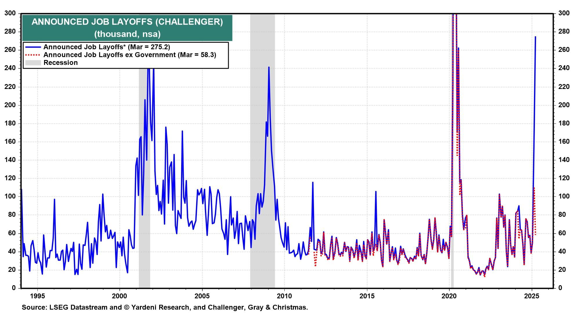 However, anecdotes about layoffs due to tariffs are starting to pop up. Also, Challenger announced that layoffs have spiked, though mostly in the government sector (chart). Federal unemployment claims have actually been falling lately.