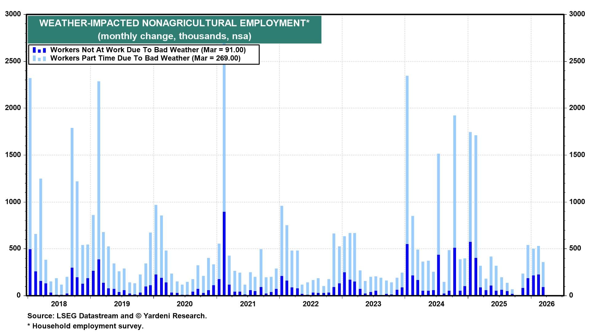 (3) Unemployment. Friday's payroll employment report surprised to the upside, offering reassurance on the near-term health of the labor market. Initial jobless claims (Thu) have continued to trend lower, with the four-week moving average at 207,800 (chart). So far, there is no evidence in the claims data that the war is weakening the labor market.