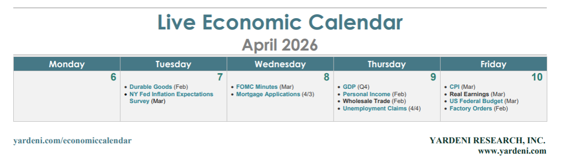 (3) Unemployment. Friday's payroll employment report surprised to the upside, offering reassurance on the near-term health of the labor market. Initial jobless claims (Thu) have continued to trend lower, with the four-week moving average at 207,800 (chart). So far, there is no evidence in the claims data that the war is weakening the labor market.