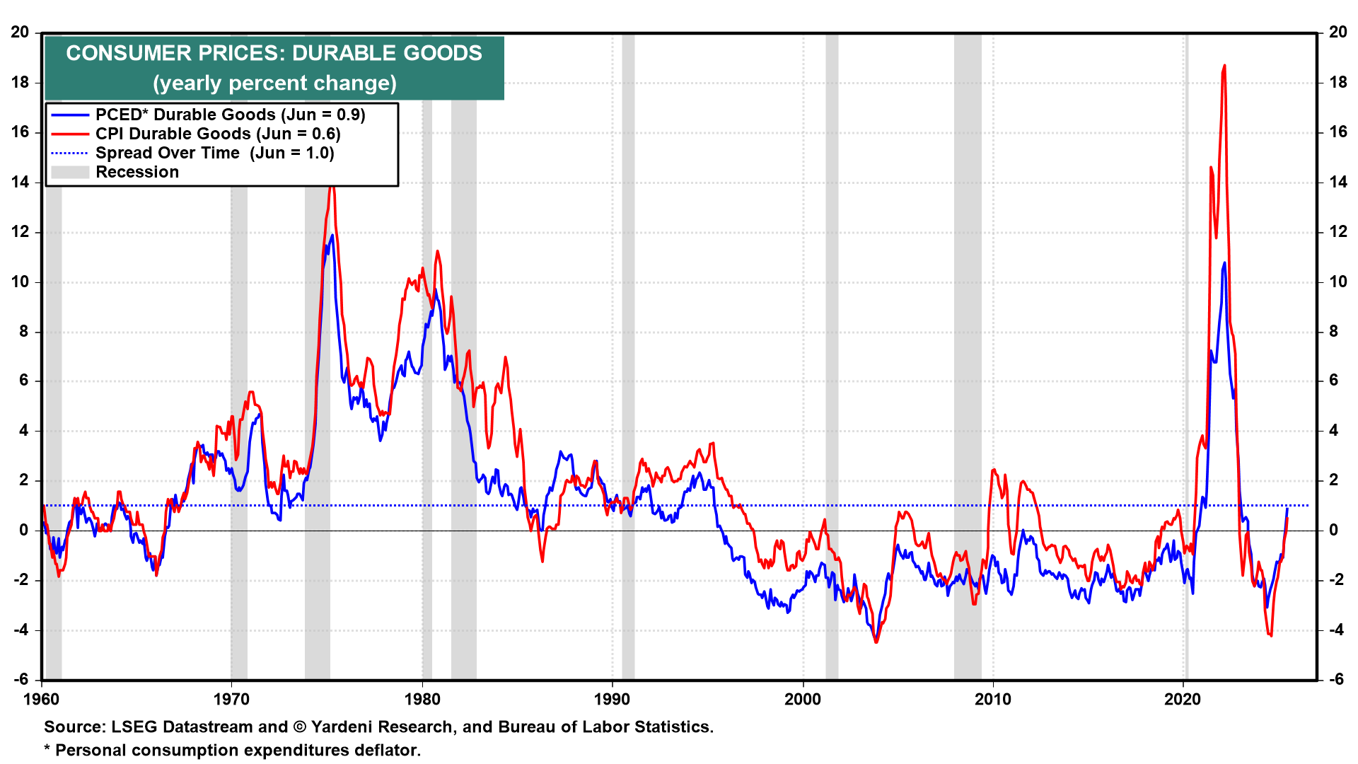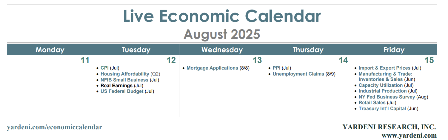 (1) CPI. The odds are low that we’ll see downside surprises in July CPI inflation data (Tue). There’s little doubt that tariff effects are boosting durable goods inflation, as they did in June. But the risk of a big upward surprise is tempered by signs that rents and used car prices are cooling. The Cleveland Fed’s Inflation Nowcasting model has the CPI rising 3.04% in July and 3.02% in August. Those would be considered too hot to justify Fed easing.