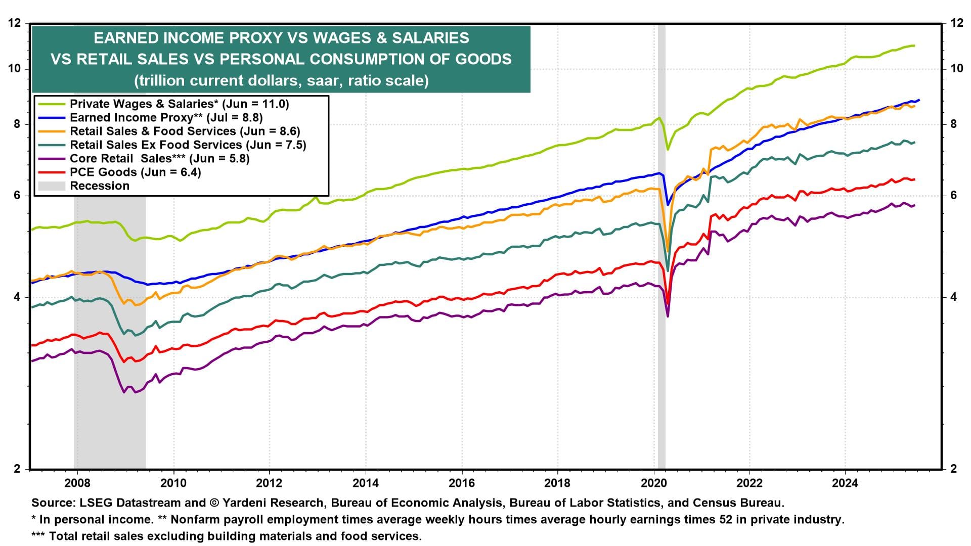 (2) Retail sales. July likely saw steady, if uninspiring, consumer spending (Fri) but perhaps not the sharp slowdown some might expect following the below-forecast July employment report. That's because our Earned Income Proxy for wages and salaries in personal income rose to a new high in July (chart).
