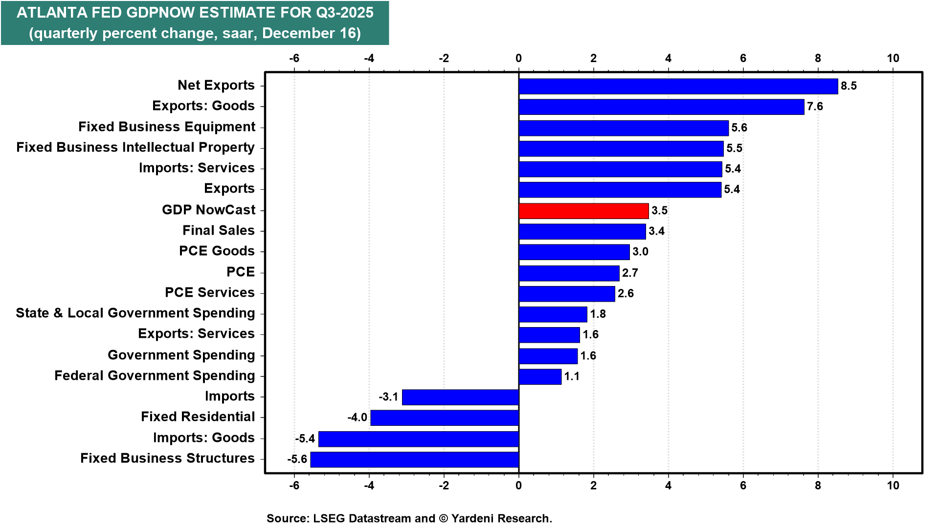 (1) GDP update. Real GDP rose 3.8% (saar) during Q2. We expect a reasonably robust 3.5% Q3 GDP report (Tue) to confirm that economic growth remains robust. This would be consistent with the Atlanta Fed’s GDPNow estimate (chart).
